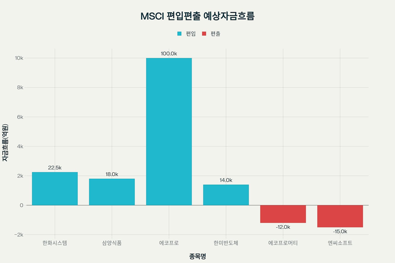 편출 종목에서는 상당한 자금 이탈이 이미 확인되고 있습니다.