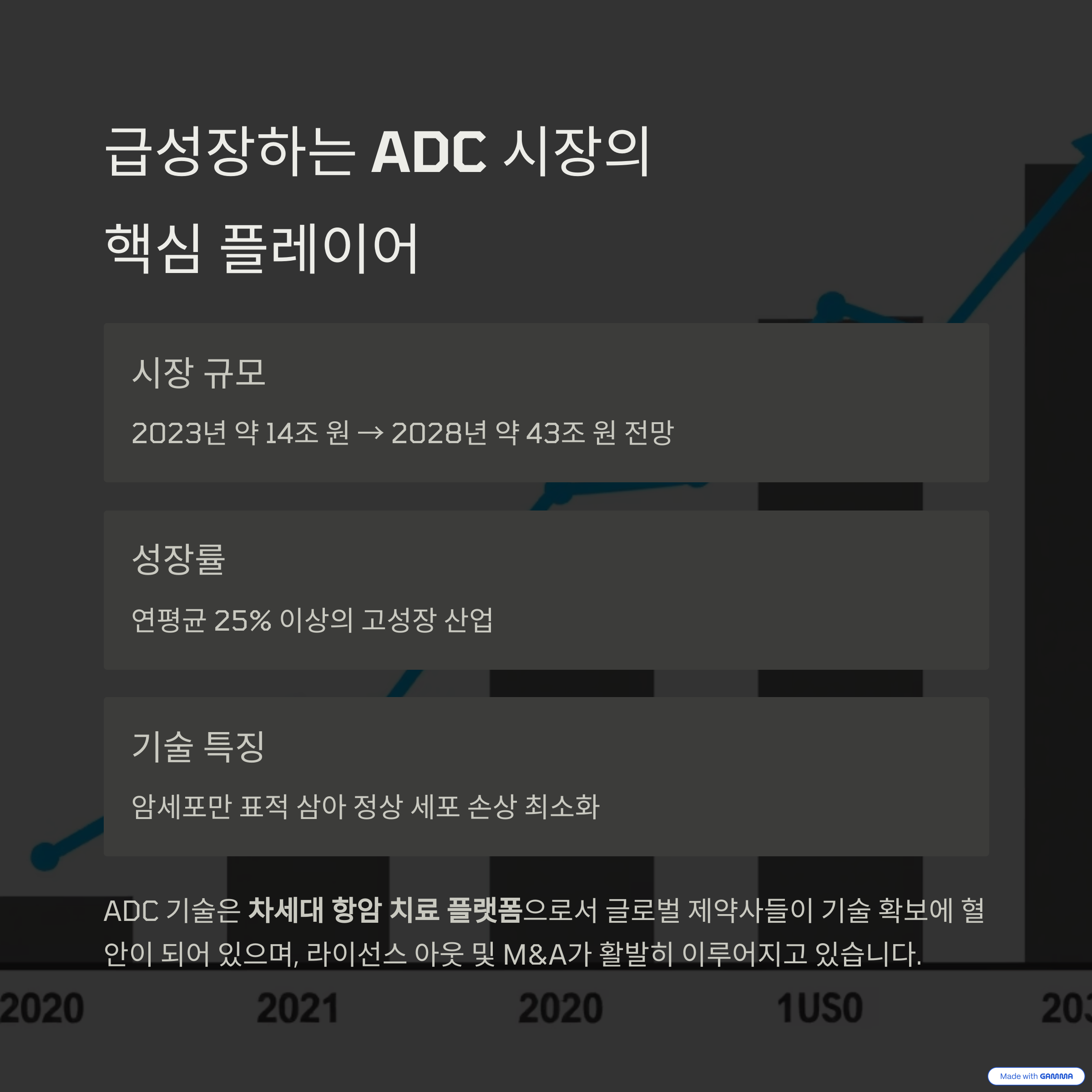 ADC 시장은 2023년 약 14조 원 규모였으나 2028년엔 약 43조 원에 이를 것으로 전망됩니다.