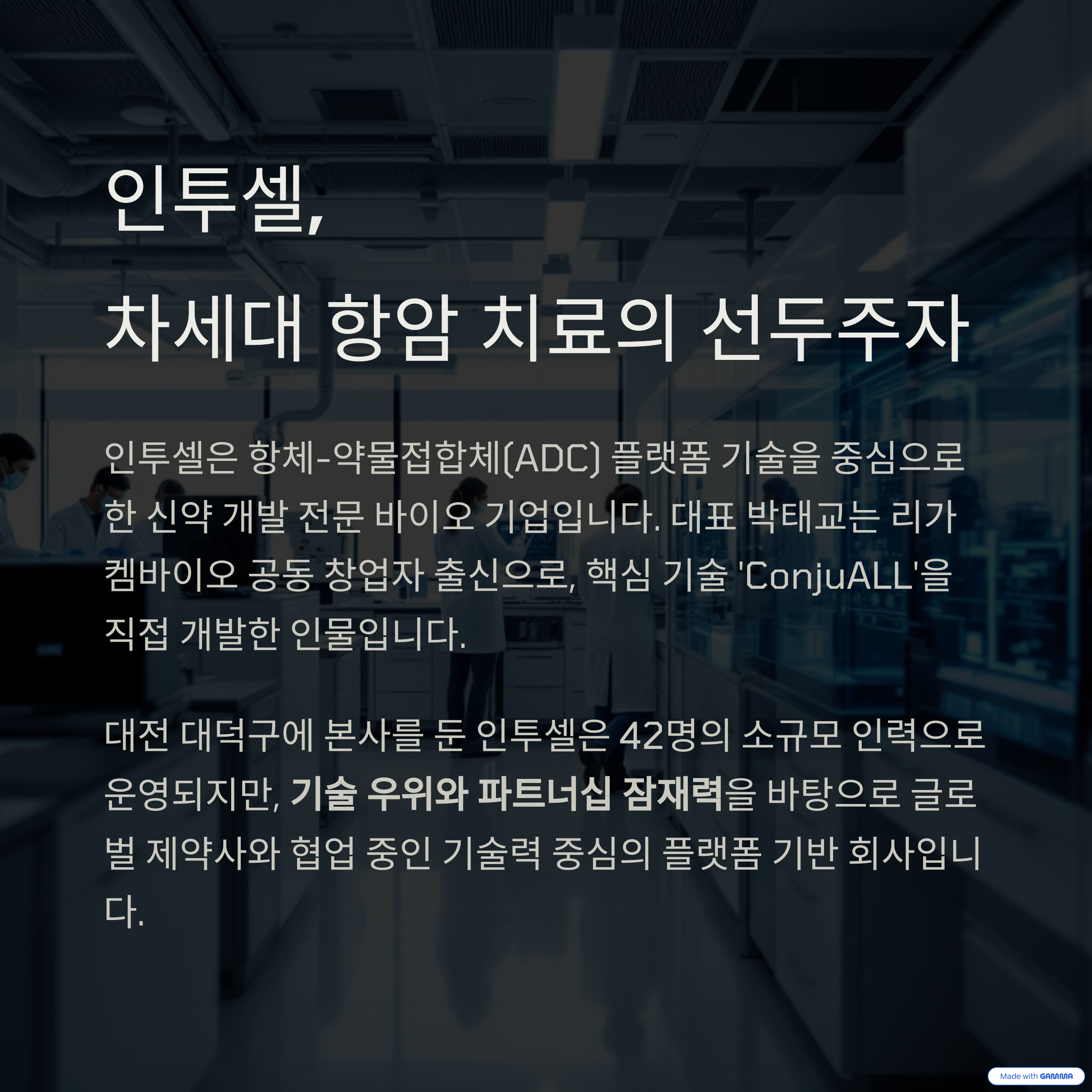 인투셀은 항체-약물접합체(ADC) 플랫폼 기술을 중심으로 한 신약 개발 전문 바이오 기업입니다.
