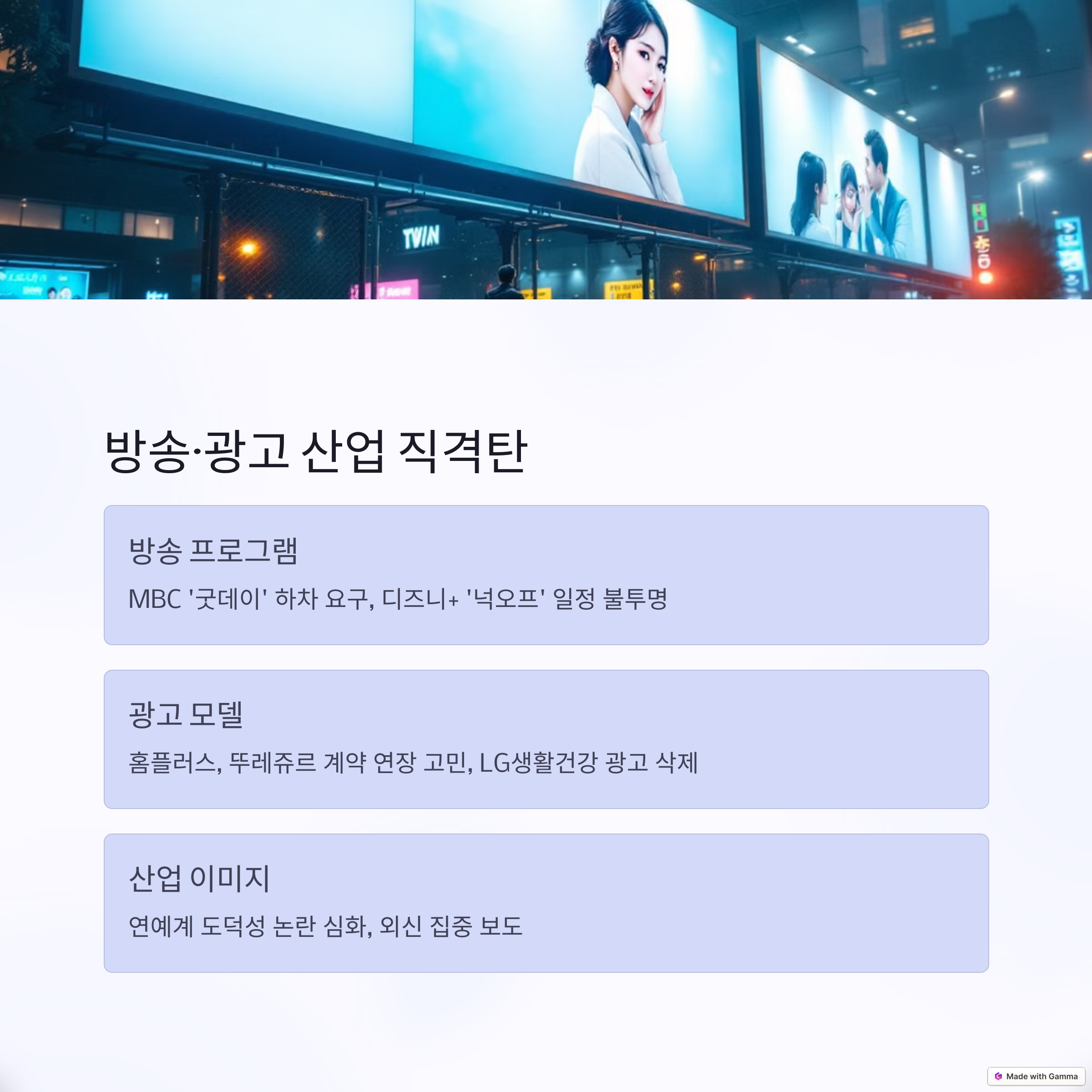 | 방송 프로그램 | MBC ‘굿데이’ 하차 요구, 디즈니+ ‘넉오프’ 공개 일정 불투명 |