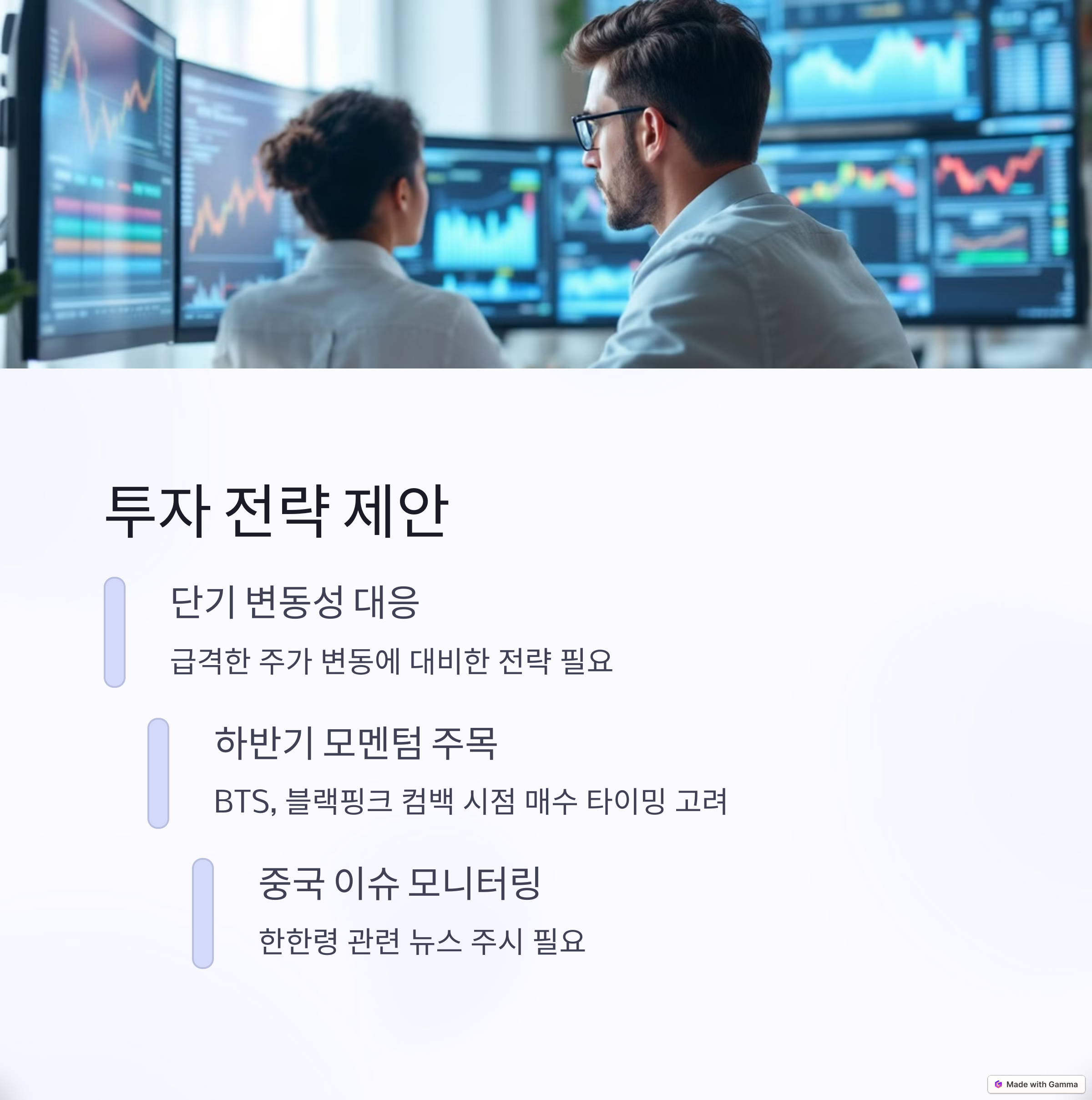 단기적인 변동성은 크지만, 장기적으론 오히려 매수 기회일 수 있습니다. 특히 BTS, 블랙핑크 컴백 시점을 잘 노려보세요. 중국 이슈도 잘 챙기셔야 하고요. 엔터주는 항상 뉴스에 민감하니 꾸준히 모니터링이 답입니다.