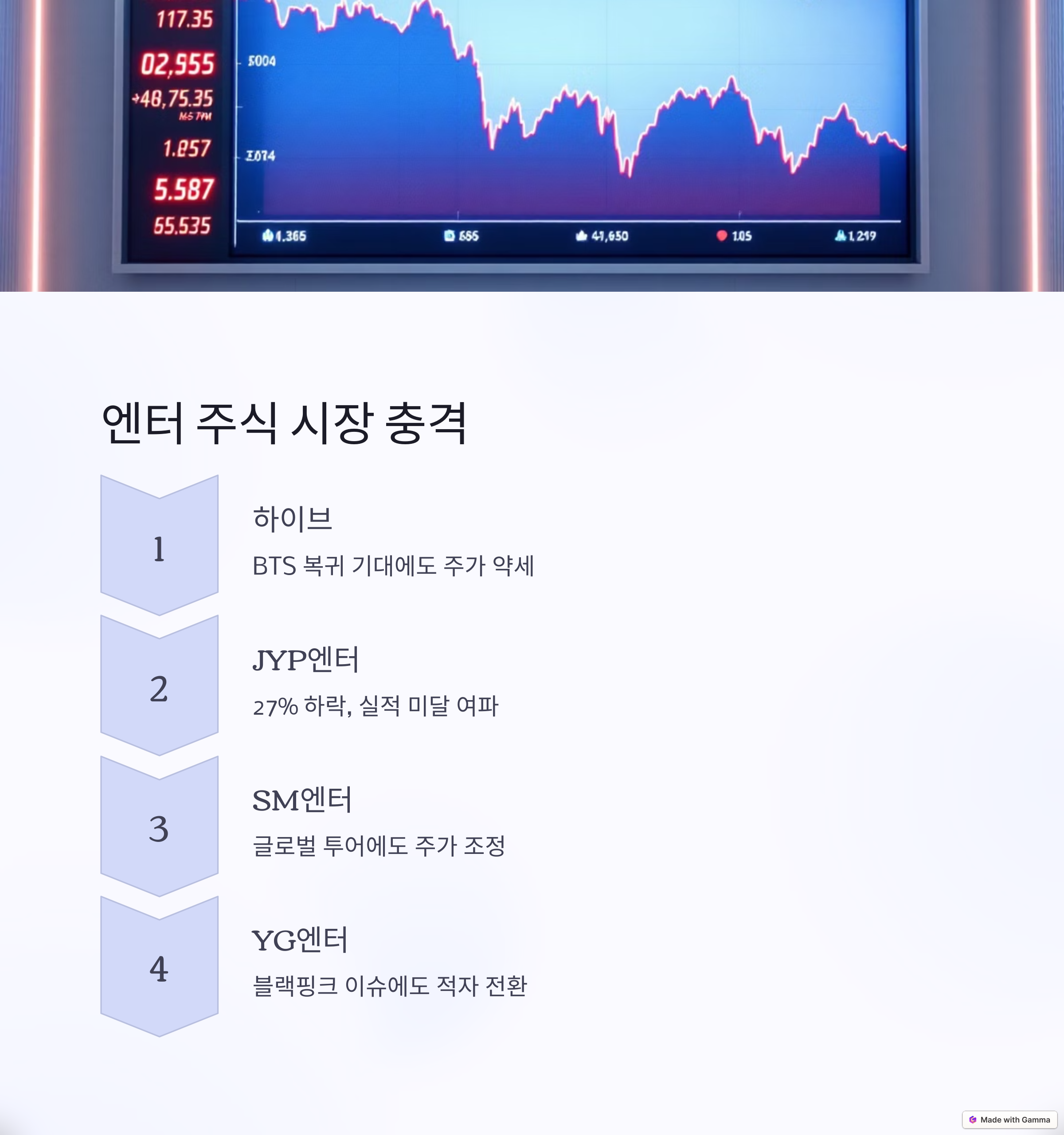 사건 직후 엔터테인먼트 주식 시장도 눈에 띄는 변동성을 보였는데요. 주요 4대 엔터사 주가는 하락했고, 투자 심리가 급격히 얼어붙었어요.