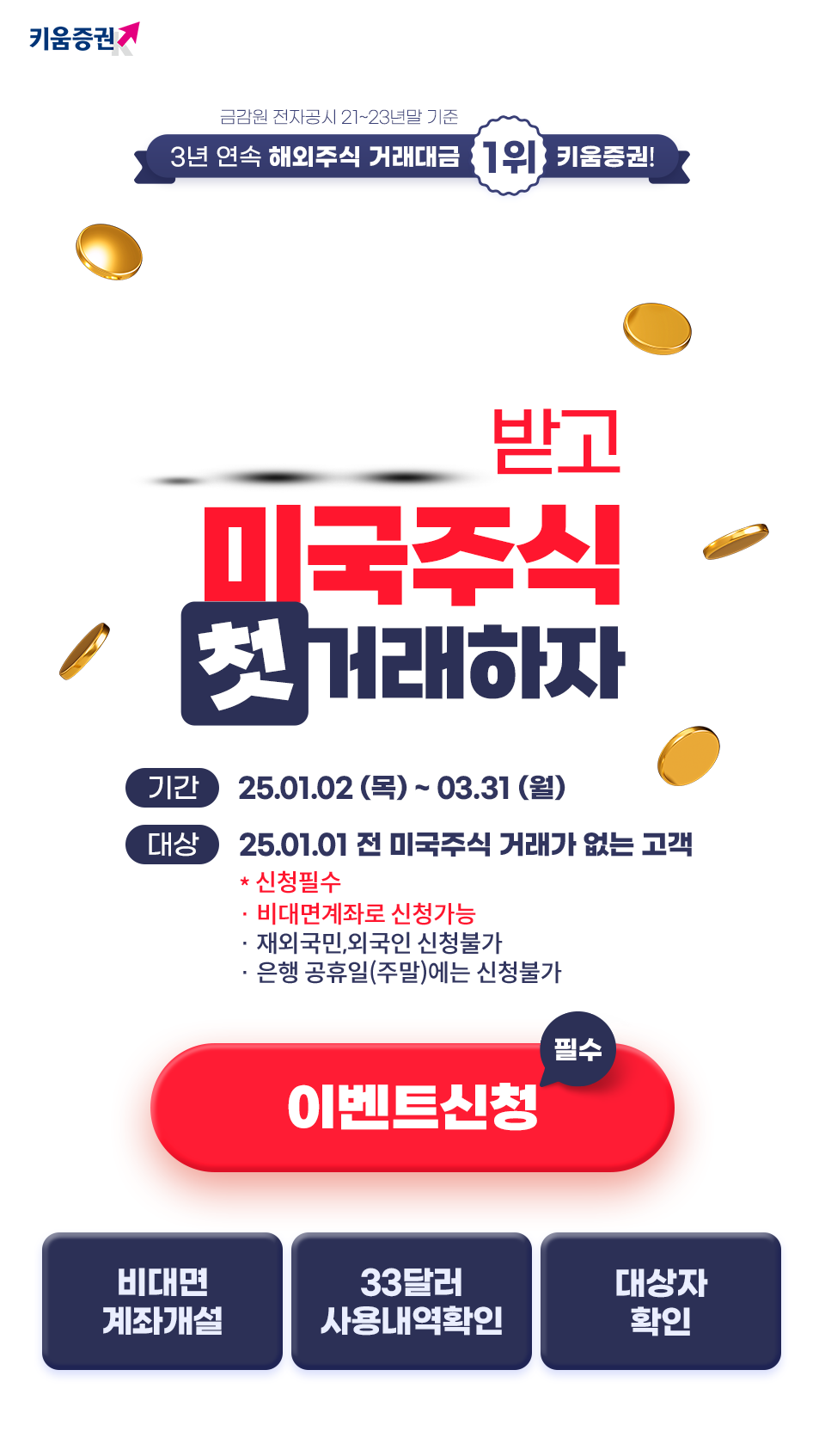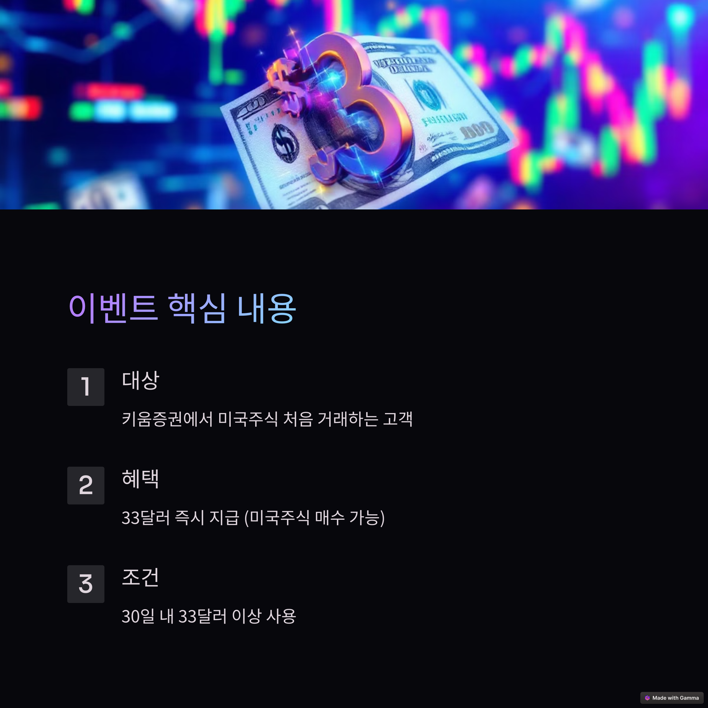 33달러를 받고 미국주식을 시작할 수 있는 기회! 키움증권에서 진행하는 특별 프로모션을 지금 확인하세요.