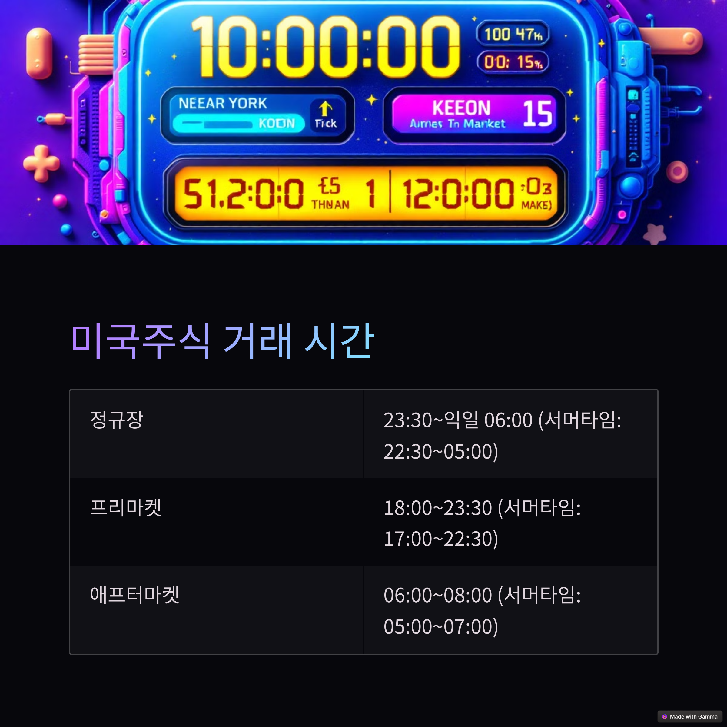 | 정규장 | 23:30 ~ 익일 06:00 (서머타임: 22:30 ~ 05:00) |