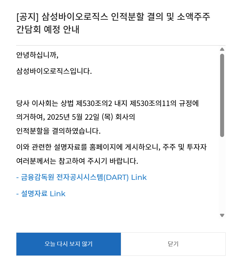 삼성바이오로직스는 2025년 5월 22일 이사회를 통해 인적분할 추진 여부를 논의할 예정이에요.