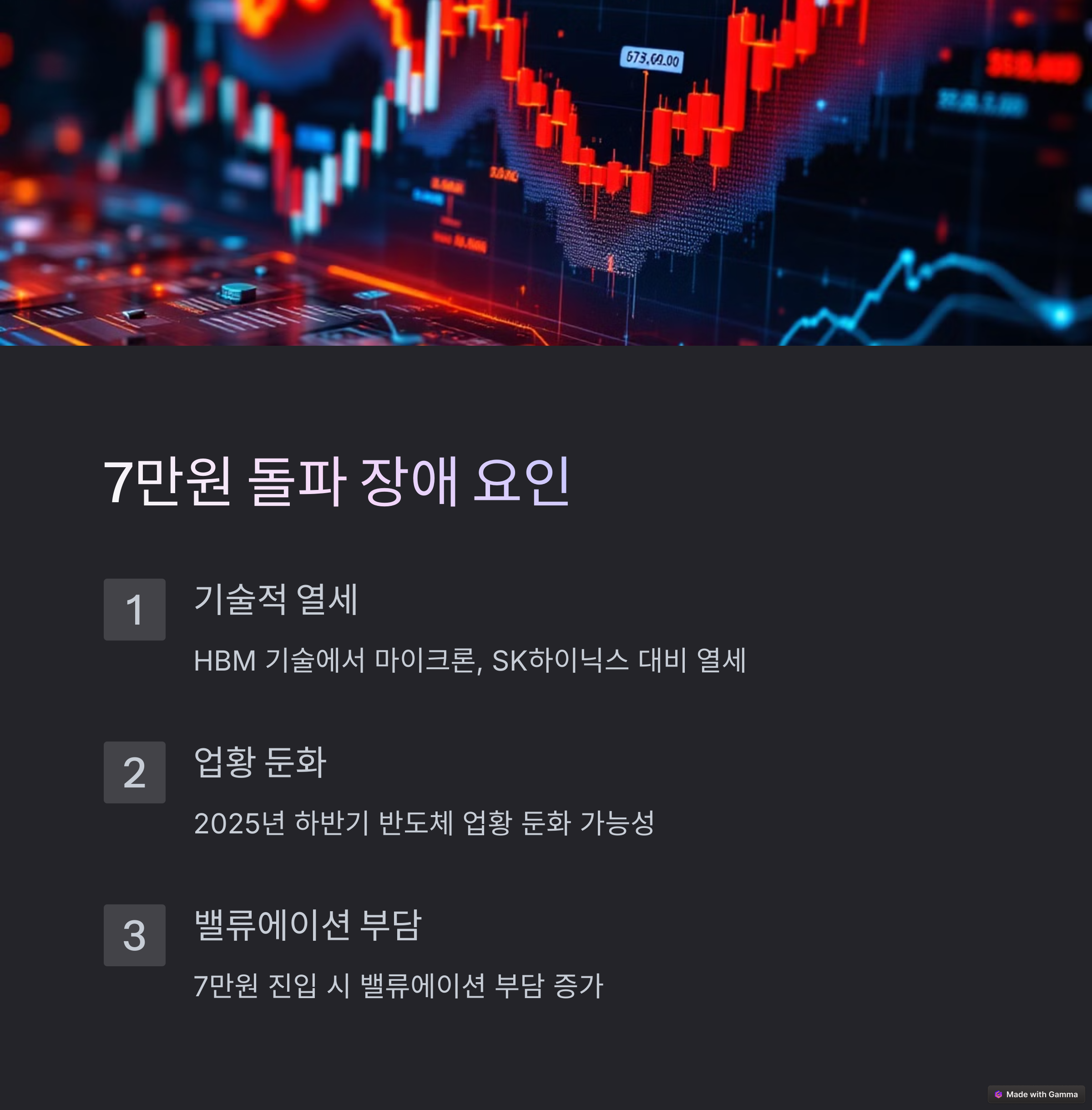 삼성전자가 7만 원을 돌파하지 못할 가능성도 무시할 수 없습니다. 특히 경쟁사 대비 기술적 열세와 실적 불확실성, 높은 밸류에이션 부담이 주요한 리스크로 작용할 수 있습니다.