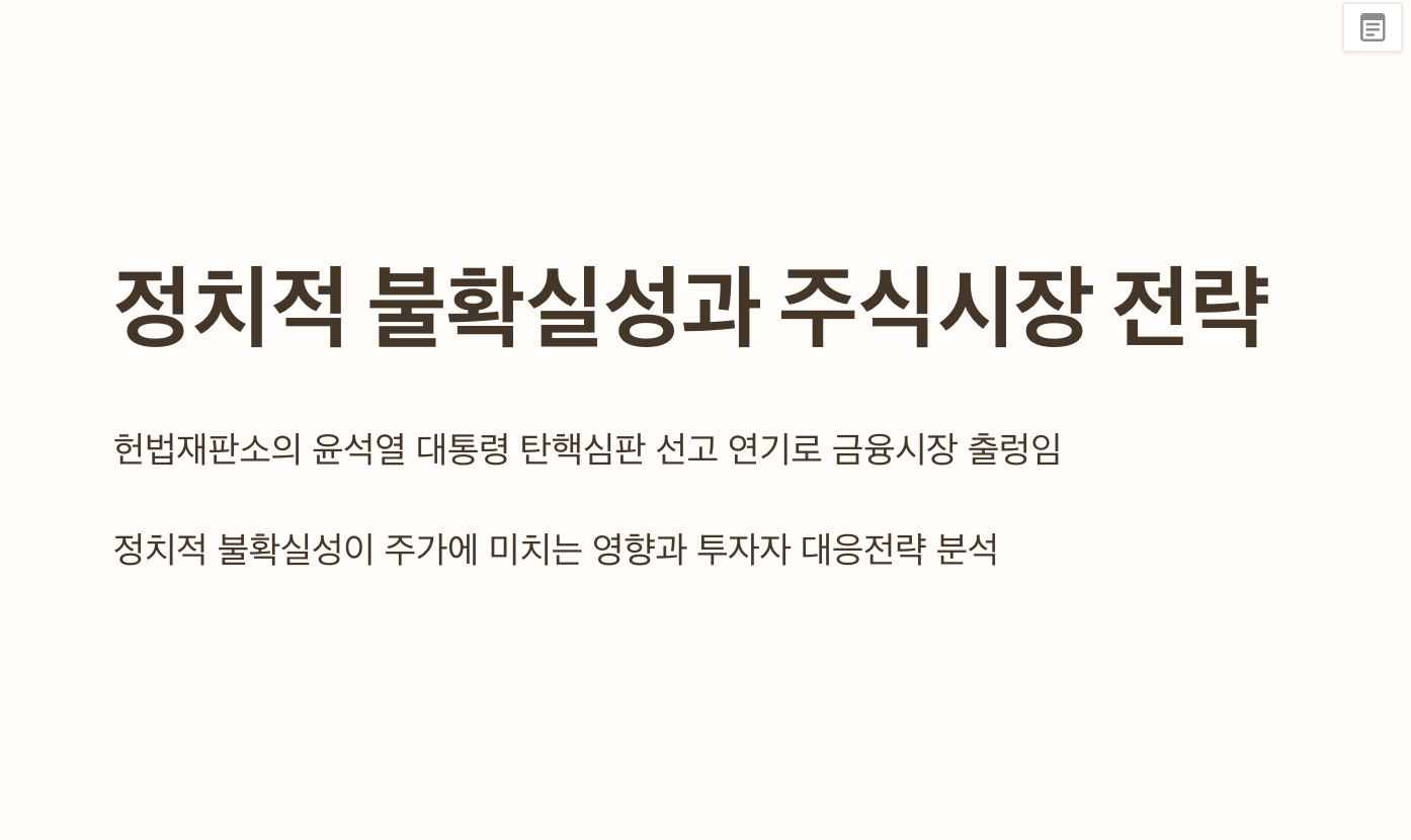 불확실성이 지속되면 시장은 어떻게 반응할까요? 과거 사례를 분석해보면 정치적 변동성이 주가에 미치는 영향을 예측할 수 있습니다. 이번 글에서는 탄핵선고 연기가 주식시장에 미치는 영향을 분석하고, 투자자들이 취할 수 있는 대응전략을 상황별로 정리해 보겠습니다.