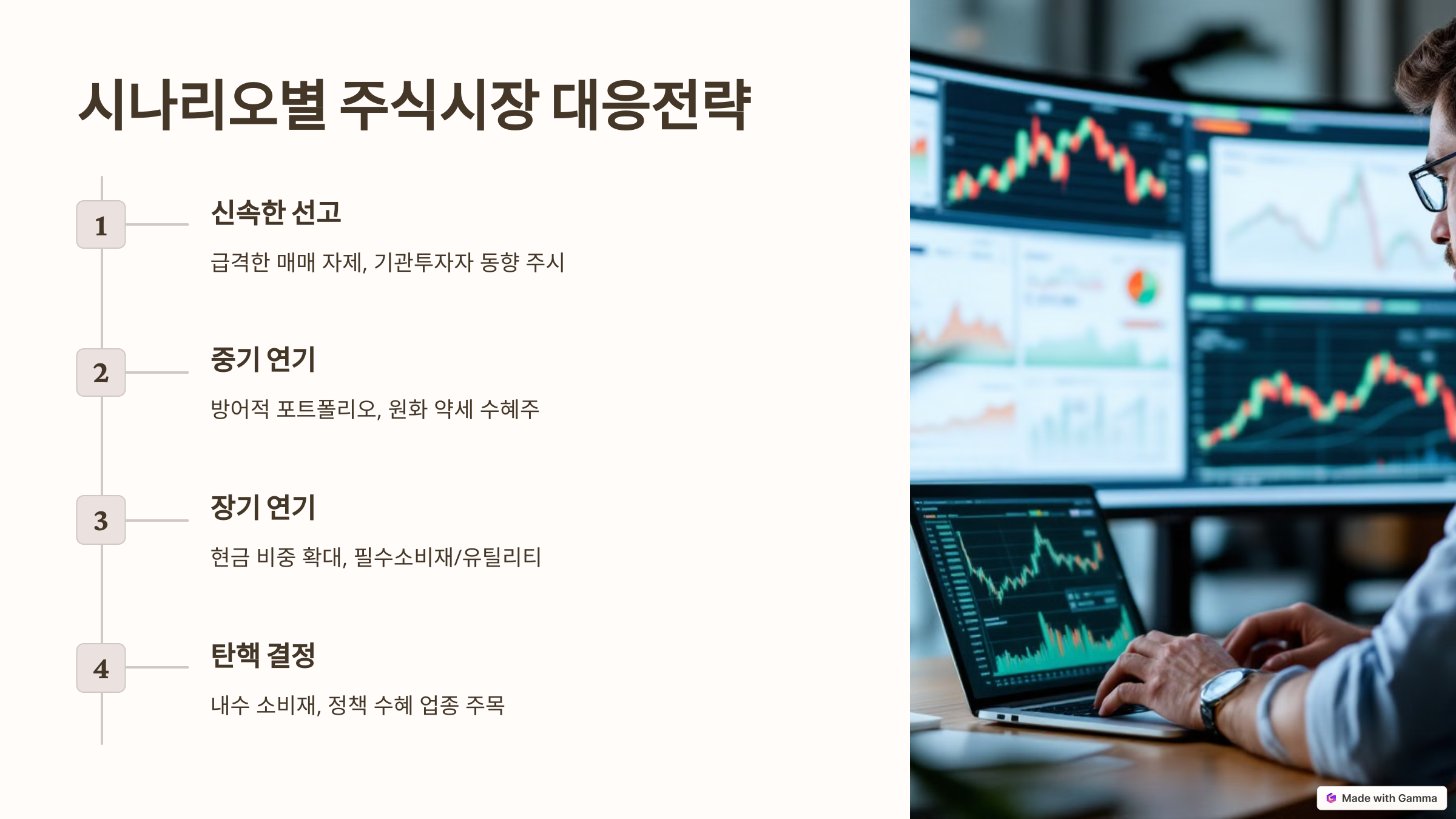 | 중기 연기 (2~4주) | 변동성 확대, 외국인 순매도 | 방어적 포트폴리오 구성, 원화 약세 수혜주 편입 |