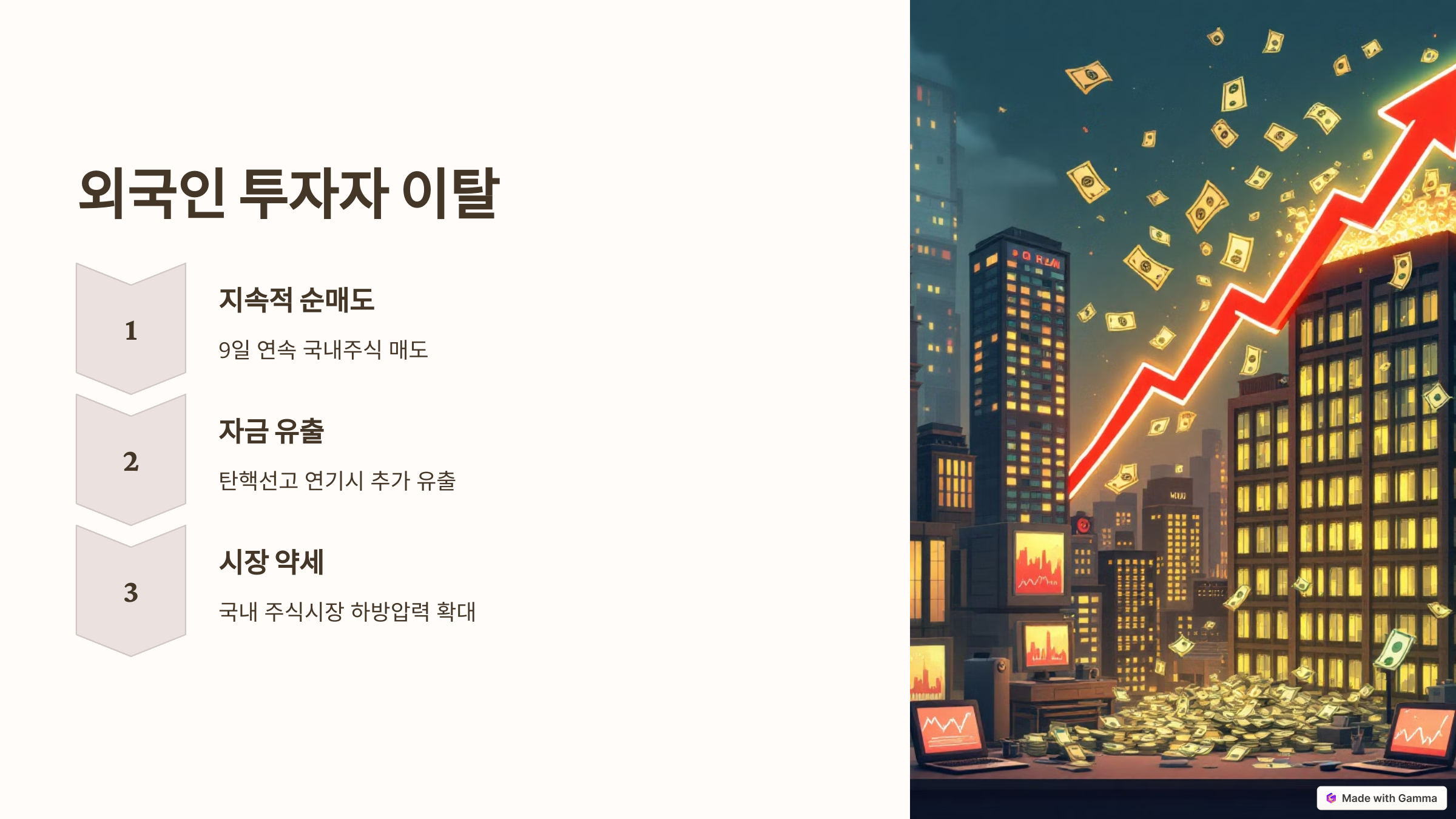 | 외국인 투자자 이탈 | 주식 매도 증가 → 외화 유출 가속화 |