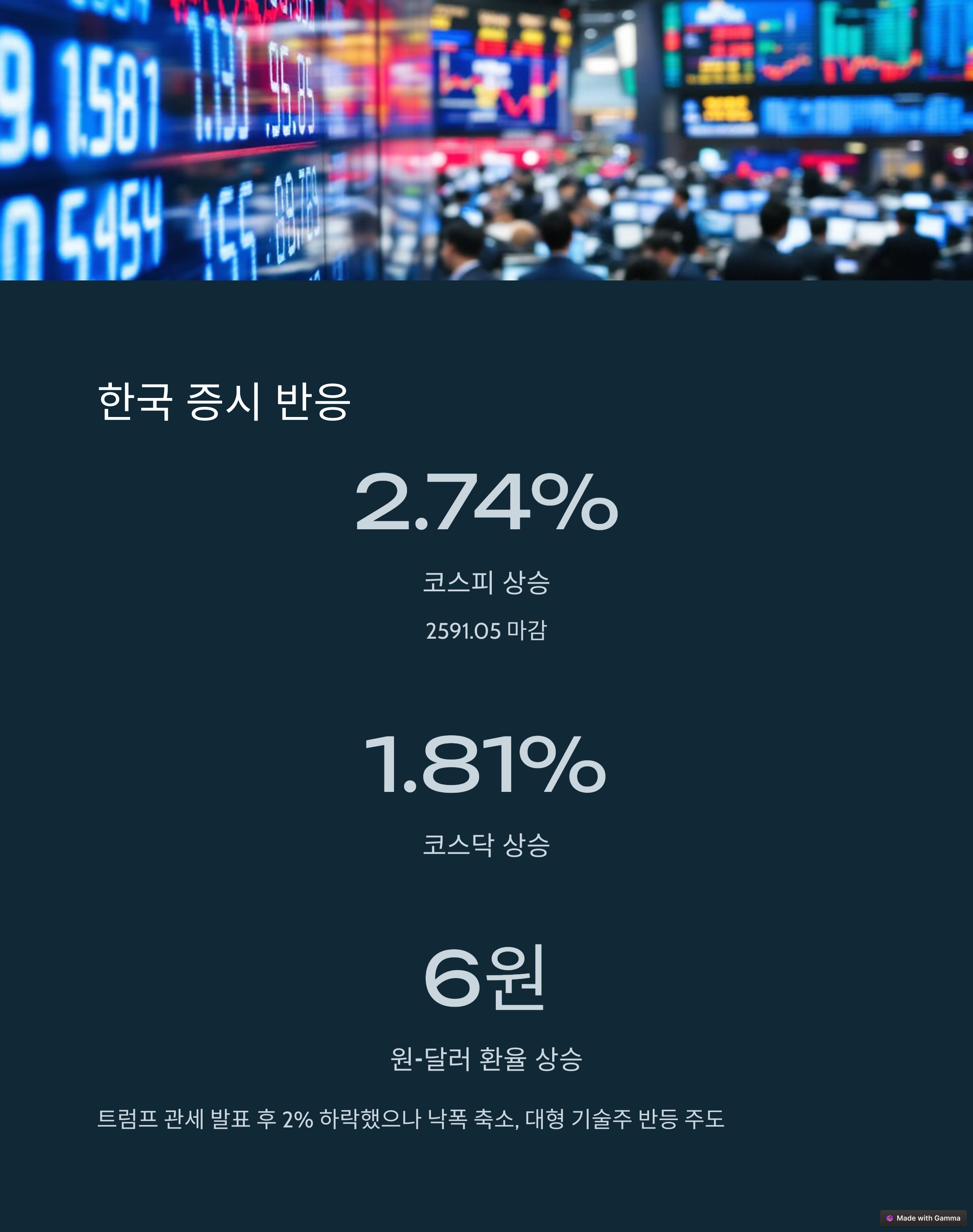 트럼프의 관세 정책 발표 직후 증시는 변동성을 보였지만, 이후 반등세를 보이며 코스피는 2,600선을 터치하는 모습을 보였습니다.