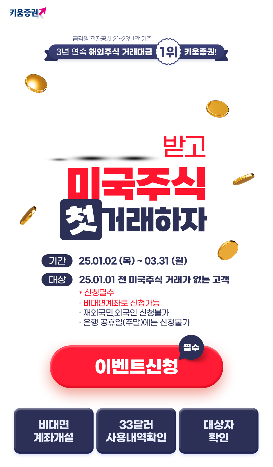 | 키움증권 | 미국주식 첫 거래 이벤트 | $33 지급 | - | 신규/휴면 고객 대상 |