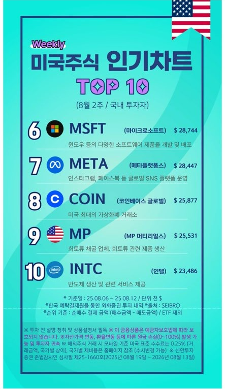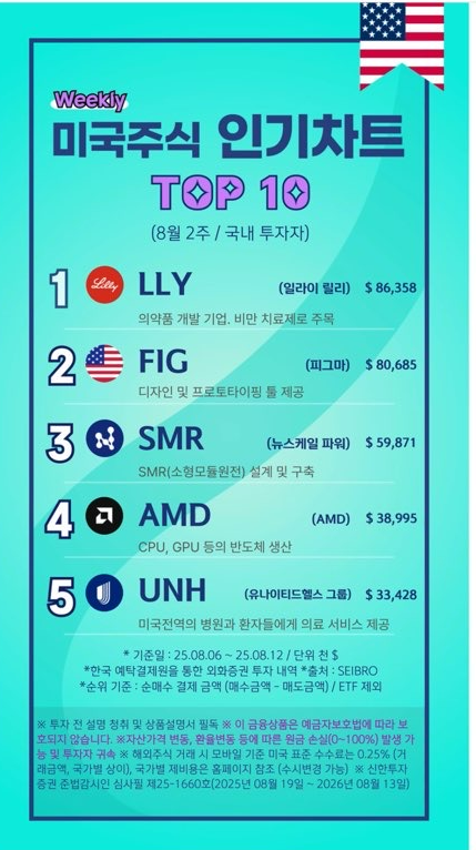 2025년 8월 2주차 미국 주식 인기 차트는 헬스케어, 반도체, 신재생에너지, 소프트웨어, 가상화폐 등