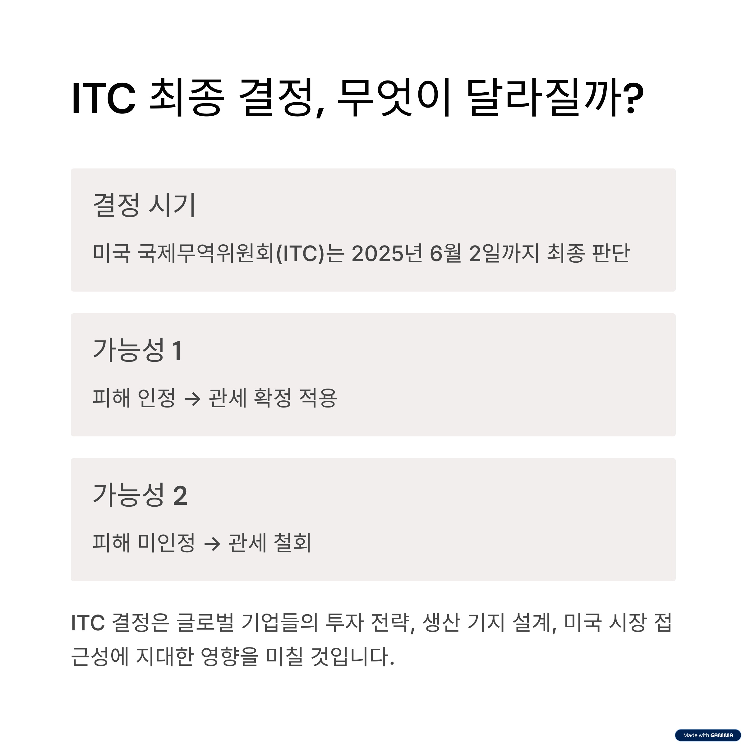 미국 국제무역위원회(ITC)는 2025년 6월 2일까지 관세 확정을 위한 최종 판단을 내릴 예정입니다.