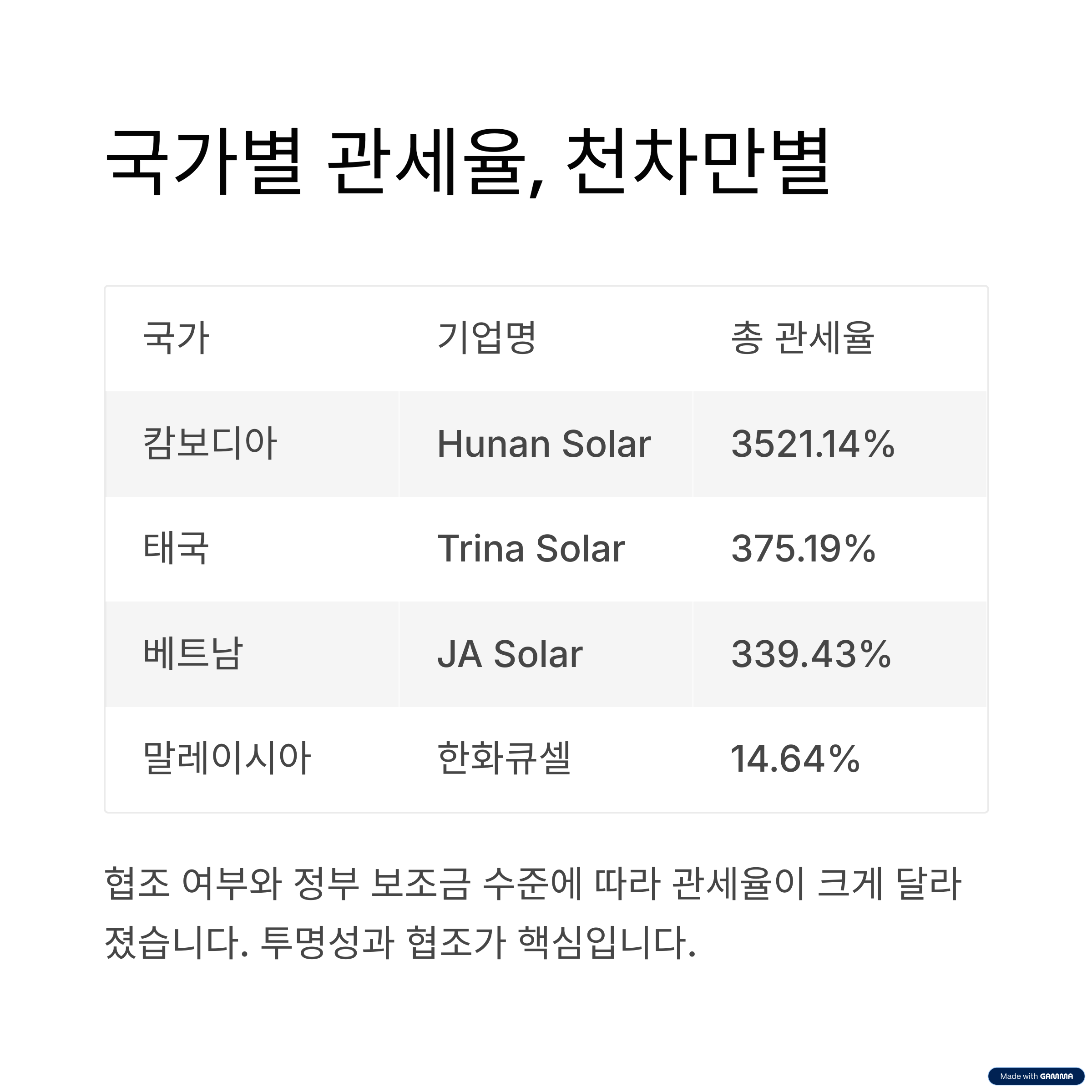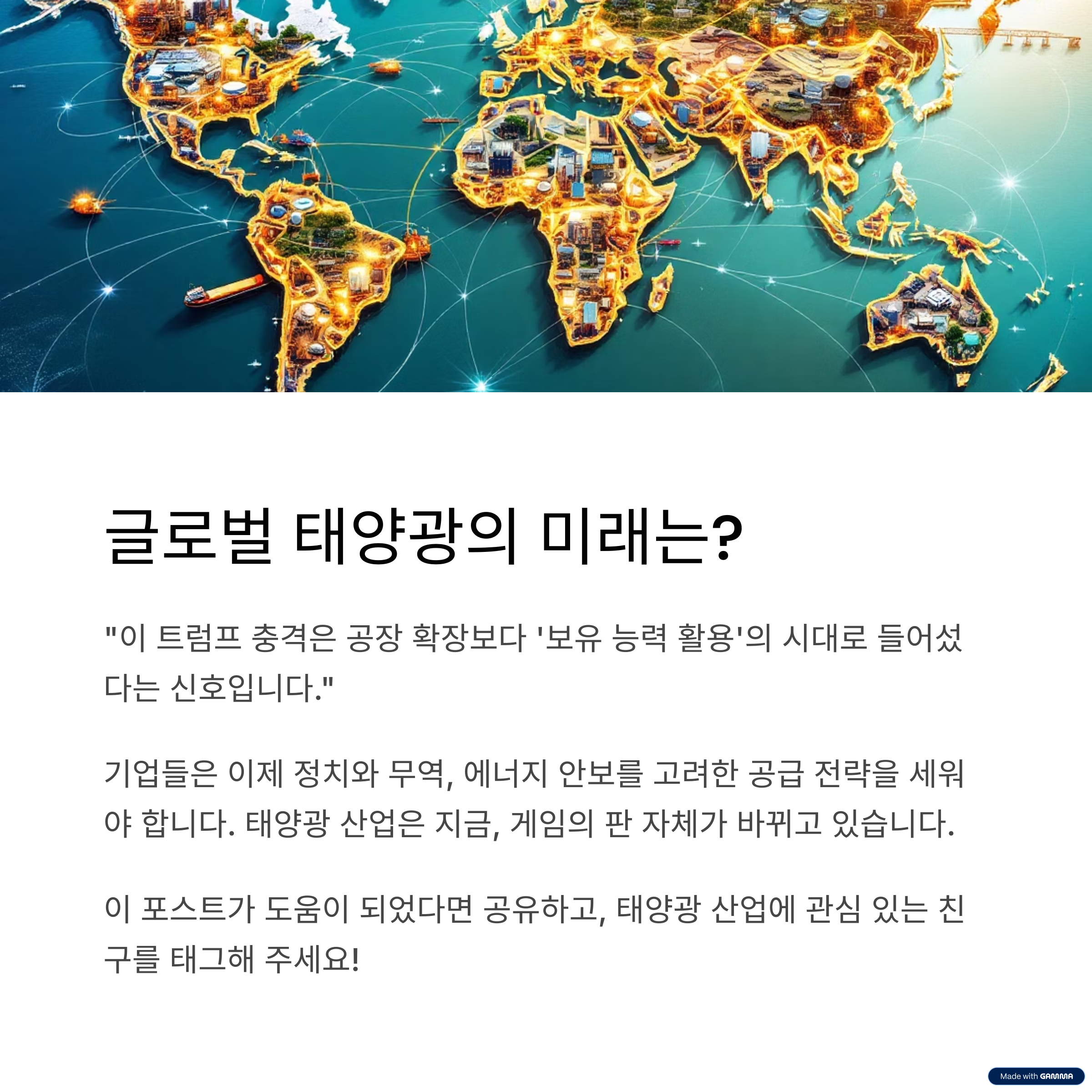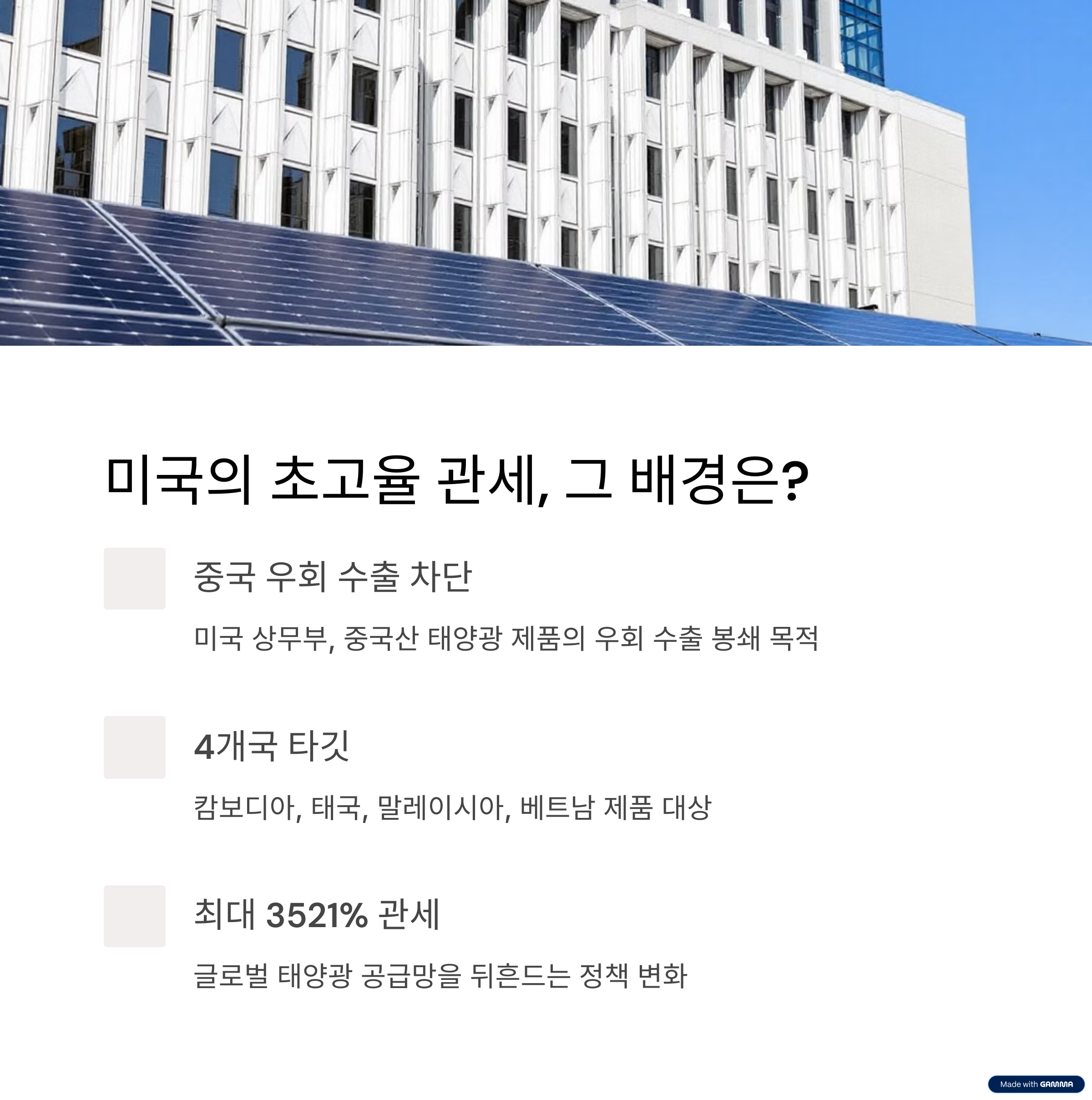 이 조치는 단순한 무역 갈등을 넘어, 글로벌 태양광 공급망을 뒤흔드는 정책 변화로 평가됩니다.