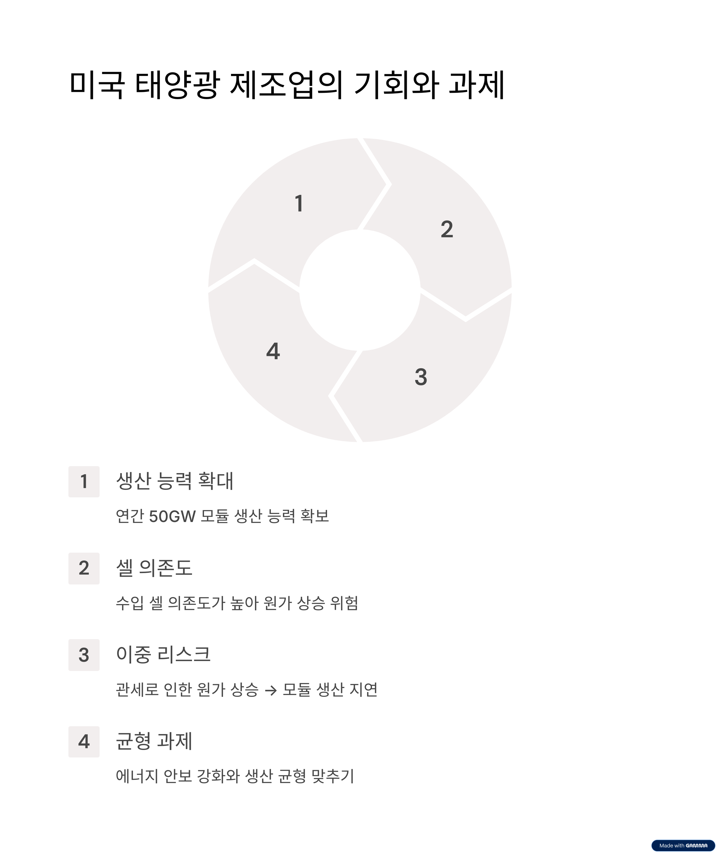 수입 셀 의존도가 높아, 관세로 인한 원가 상승 → 모듈 생산 지연이라는 이중 리스크가 존재합니다.