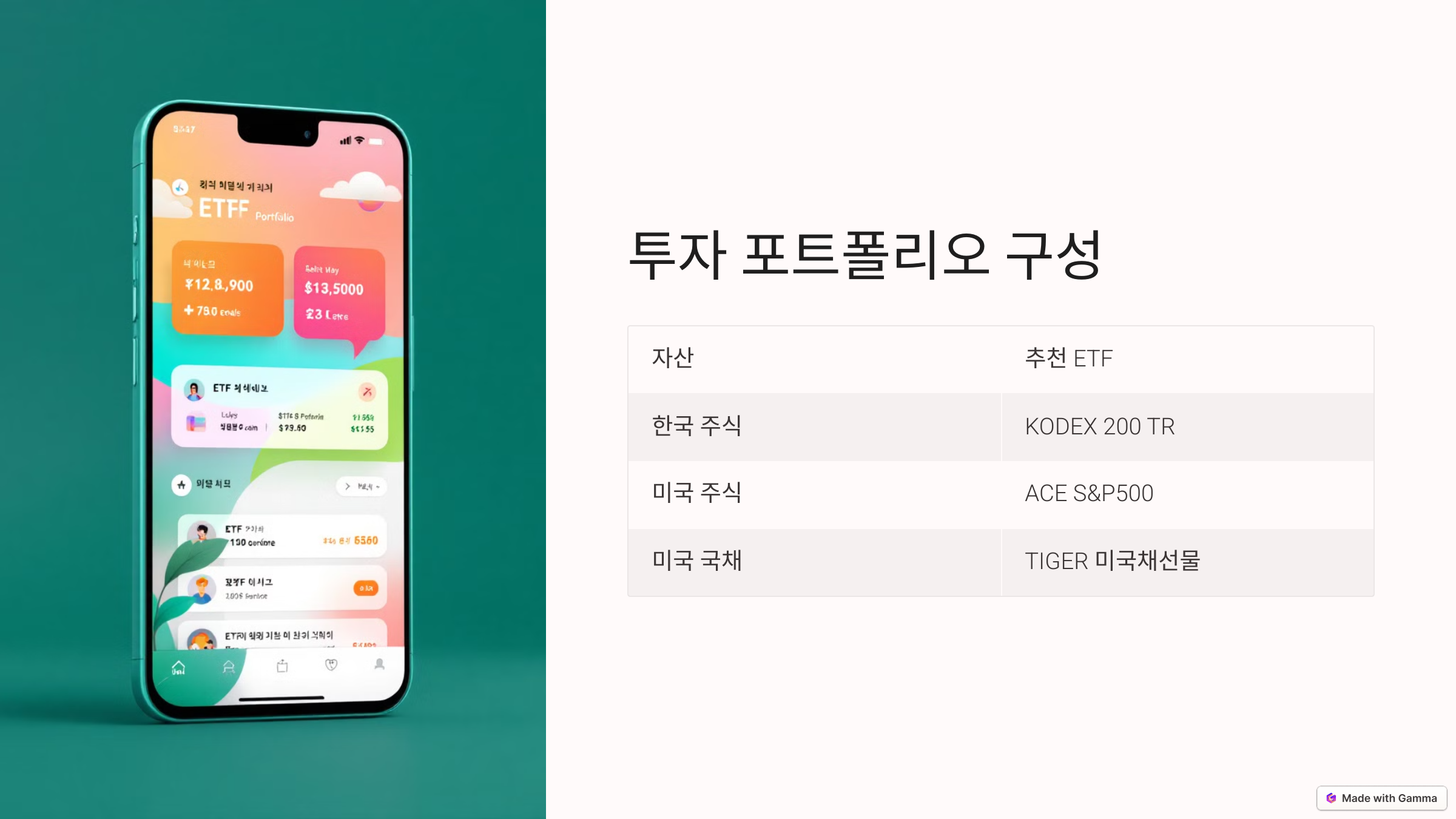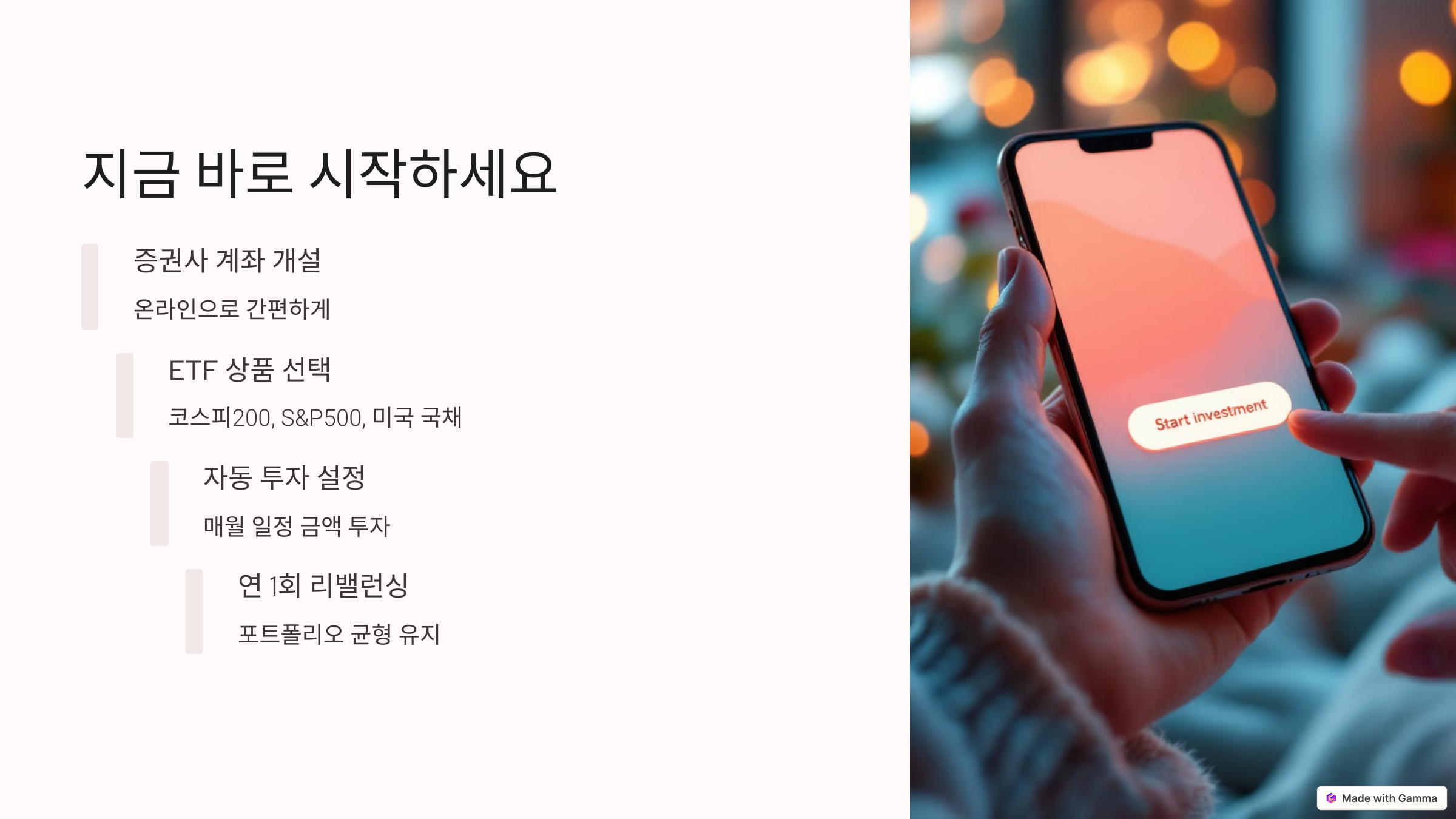 1) 증권사 계좌 개설 2) ETF 상품 선택 (코스피 200, S&P500, 미국 국채) 3) 매월 일정 금액을 자동 투자 설정 4) 연 1회 리밸런싱 실행 지금 당장 실행에 옮겨보세요!