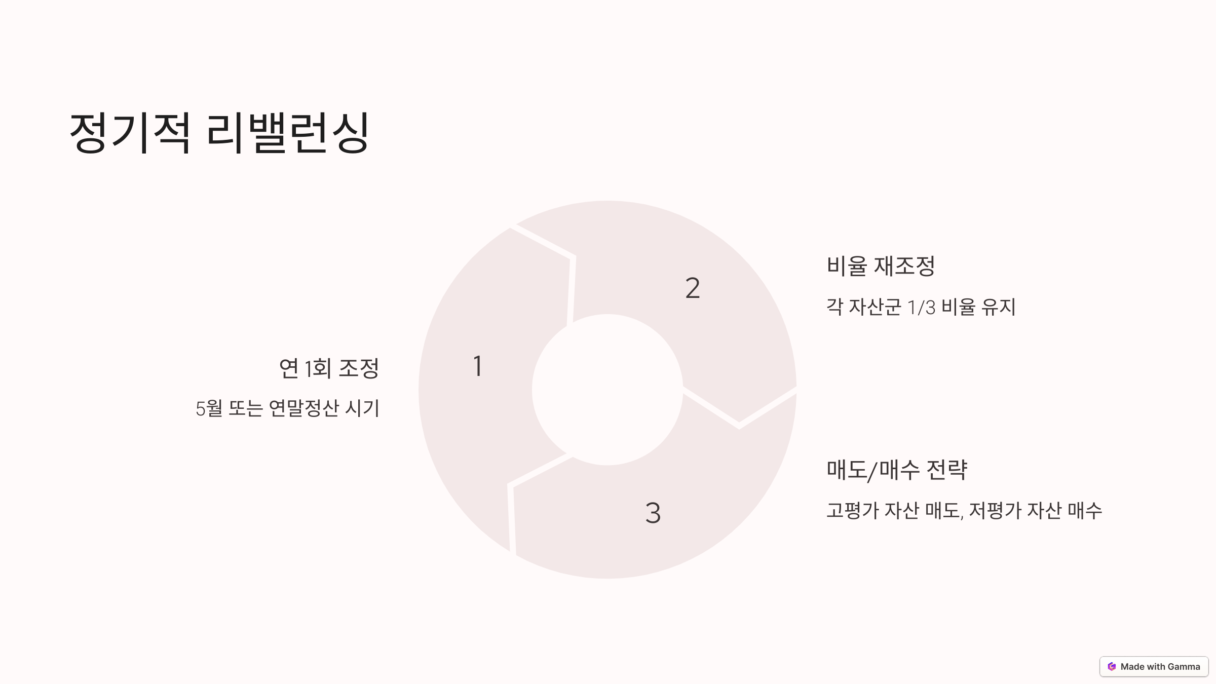 투자 3분법을 실행한 후에는 일정한 간격으로 포트폴리오를 조정하는 ‘리밸런싱’이 필요합니다. 시장 상황에 따라 특정 자산군이 더 빠르게 성장할 수 있기 때문에, 원래의 균형(1/3씩 유지)을 맞춰주는 과정이 중요합니다.