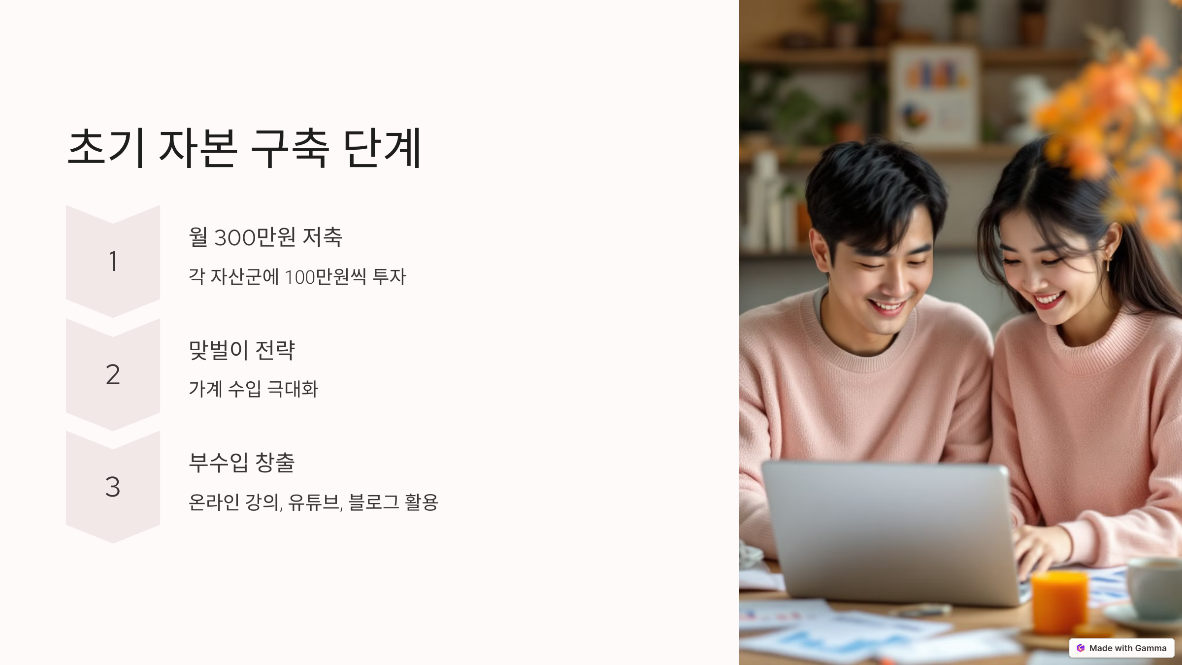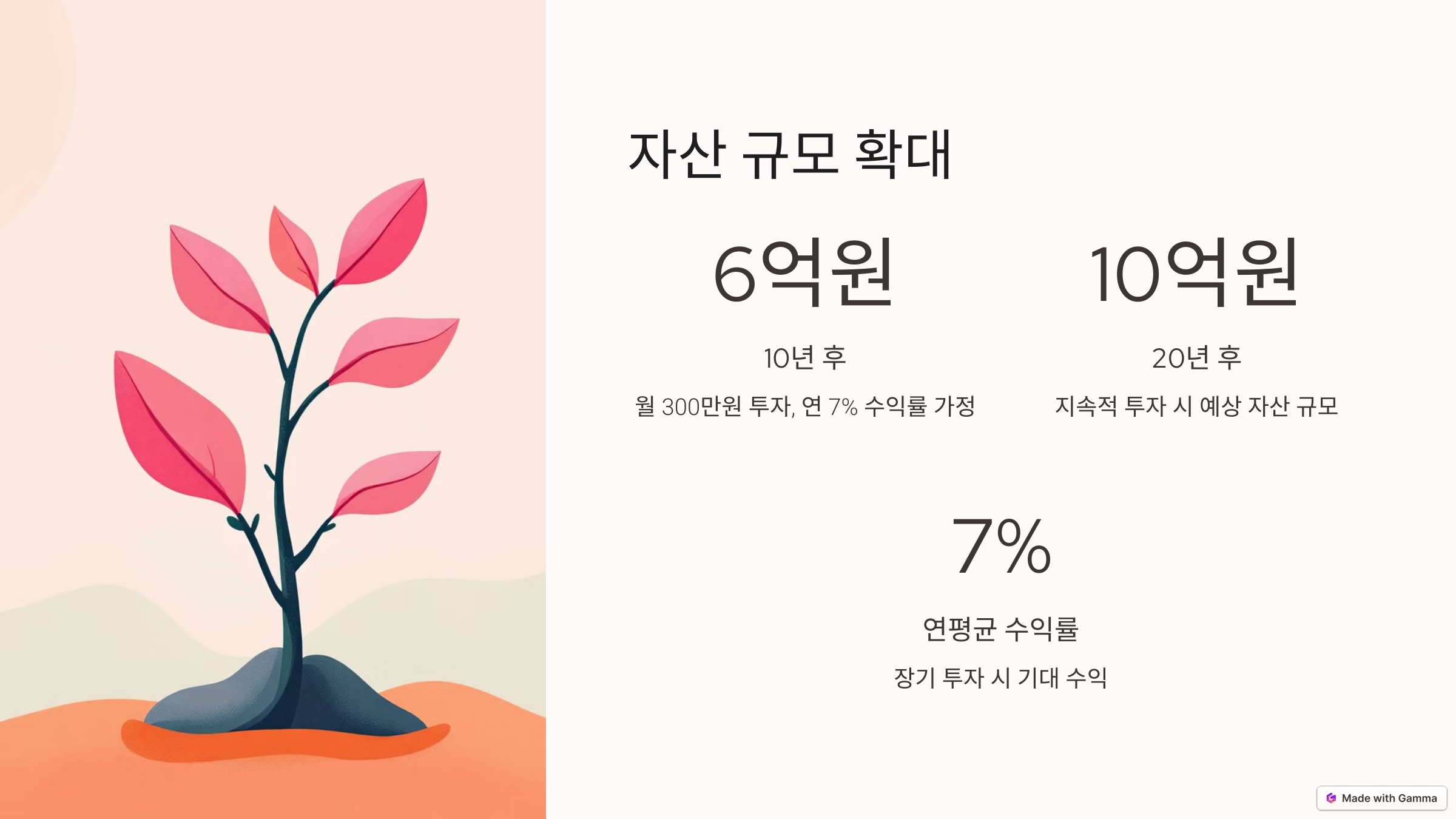 이 단계에서는 최대한 빠르게 종잣돈을 마련하는 것이 중요합니다. 부수입을 통해 수익을 늘리고, 월 300만 원씩 꾸준히 투자하면 10년 후 6억 원 이상의 자산을 확보할 수 있습니다.