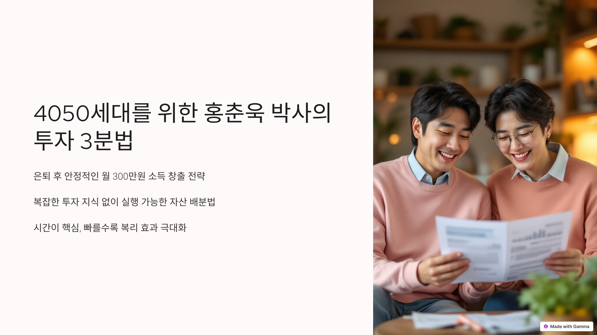 4050 세대, 은퇴 후 안정적인 월 300만 원을 원하시나요? 지금 바로 홍춘욱 박사의 '투자 3분법'을 실행하세요!