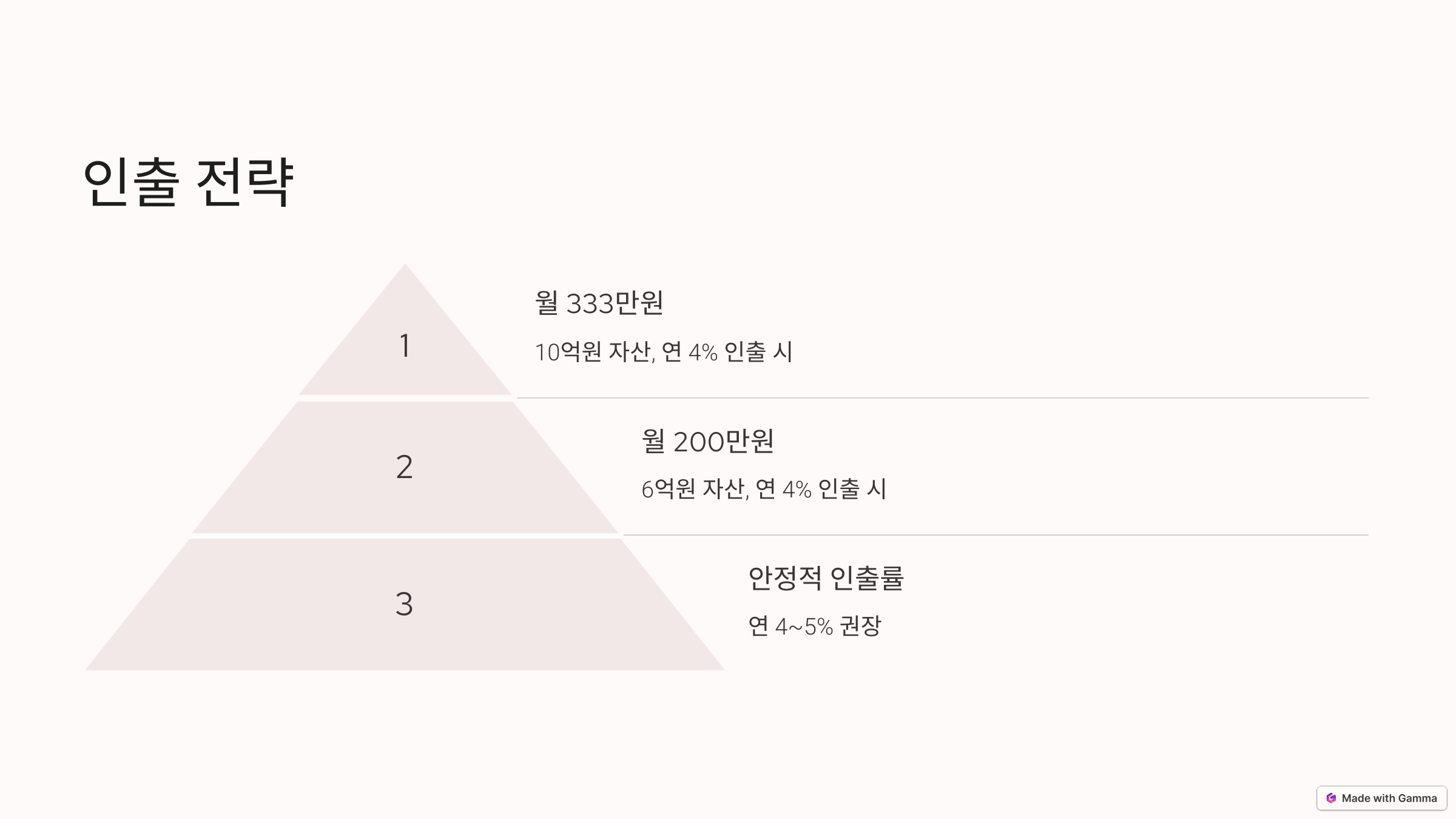 - 10억원 투자 시: 연 4% 인출 → 월 333만 원 소득