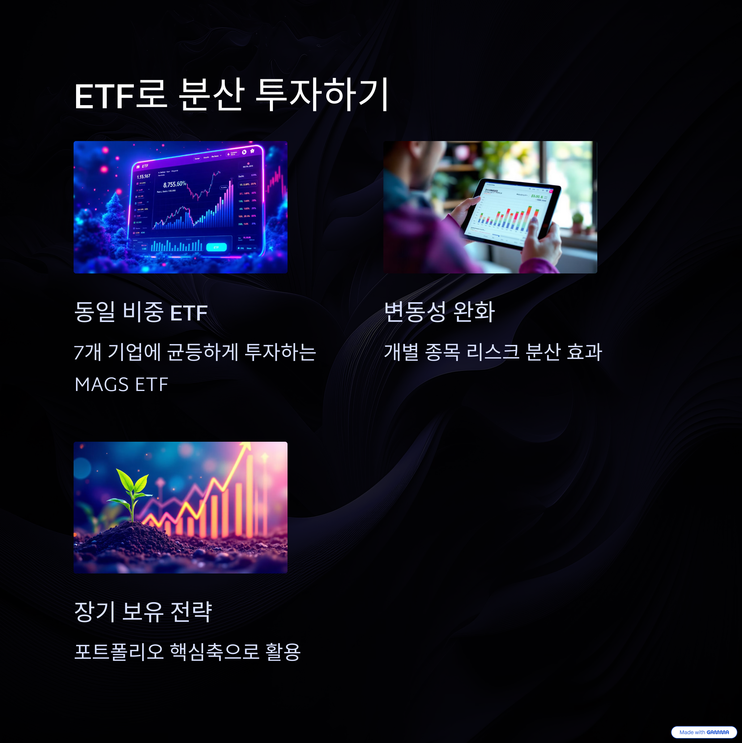예를 들어 MAGS ETF는 각 종목에 동일한 비율로 투자하며, 개별 종목의 단기 변동성을 완화하는 효과를 기대할 수 있습니다.