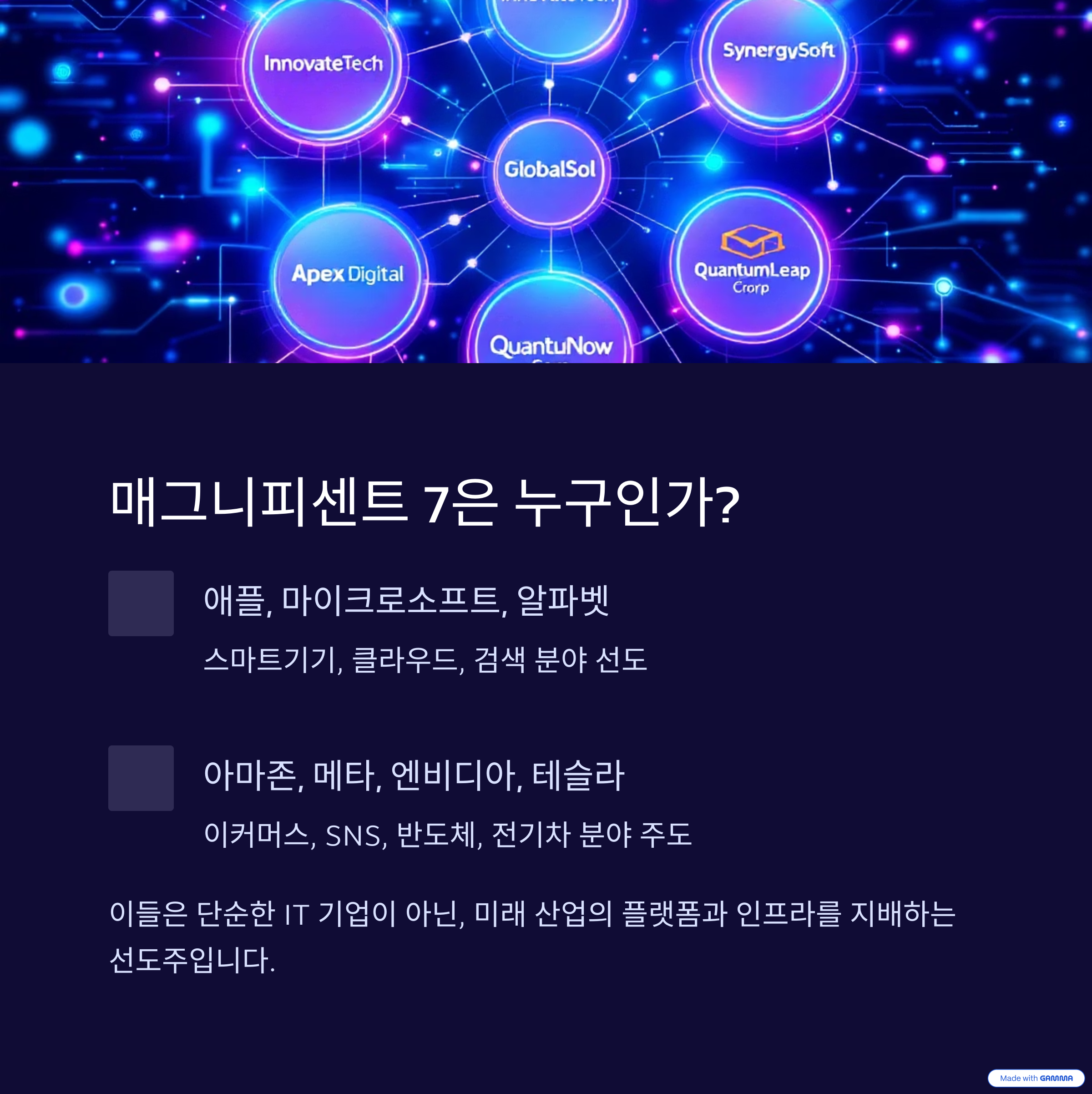 핵심: 이들 기업은 단순한 IT 기업이 아닌, 미래 산업의 플랫폼과 인프라를 지배하고 있는 선도주입니다.