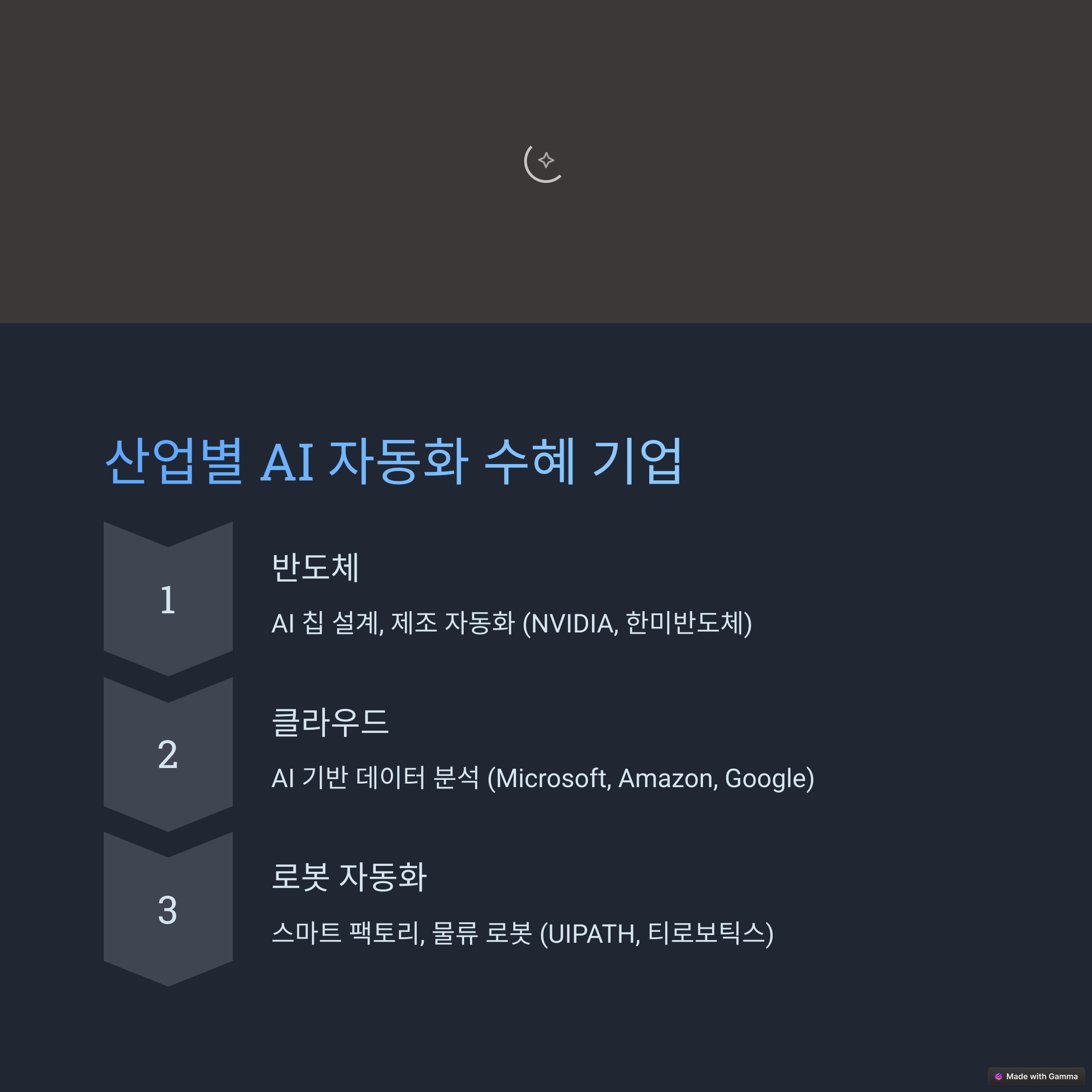 AI 자동화 기술은 다양한 산업에 적용되며, 각 산업별로 주요 수혜 기업들이 다릅니다. 아래 표는 산업별 AI 자동화 적용 현황과 주요 수혜 기업을 정리한 것입니다.
