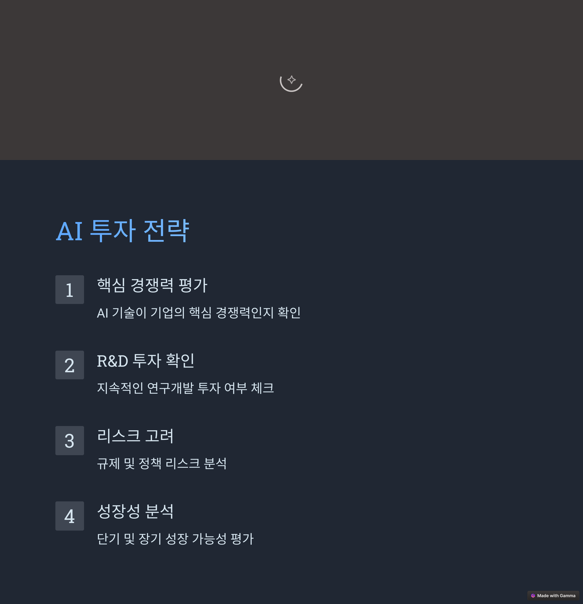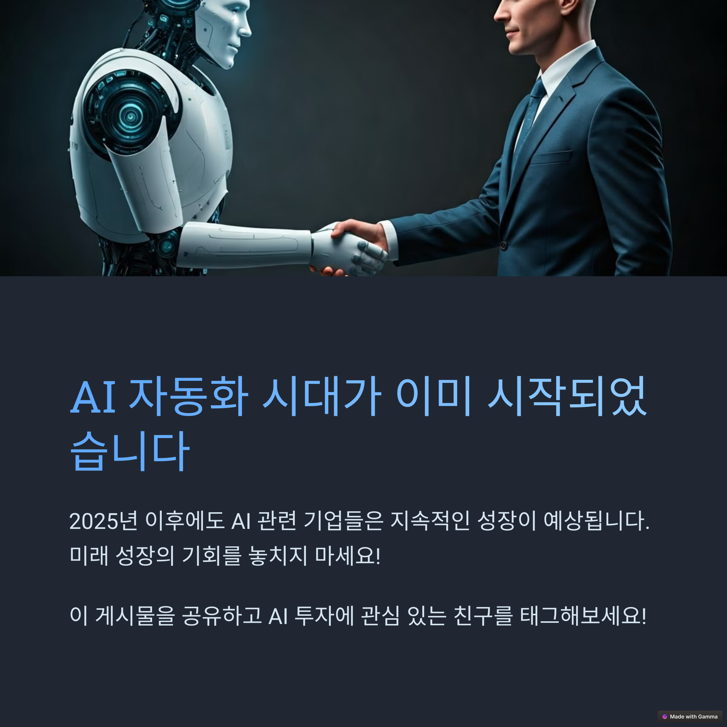 AI 자동화 시대는 이미 시작되었습니다. 기업들은 AI 기술을 활용해 생산성을 높이고 비용을 절감하며, 혁신적인 제품과 서비스를 선보이고 있습니다. 2025년 이후에도 AI 관련 기업들은 지속적인 성장 가능성을 보일 것으로 예상되며, 투자자들은 기술력과 시장 점유율, 재무 건전성을 종합적으로 고려하여 투자 결정을 내려야 합니다.