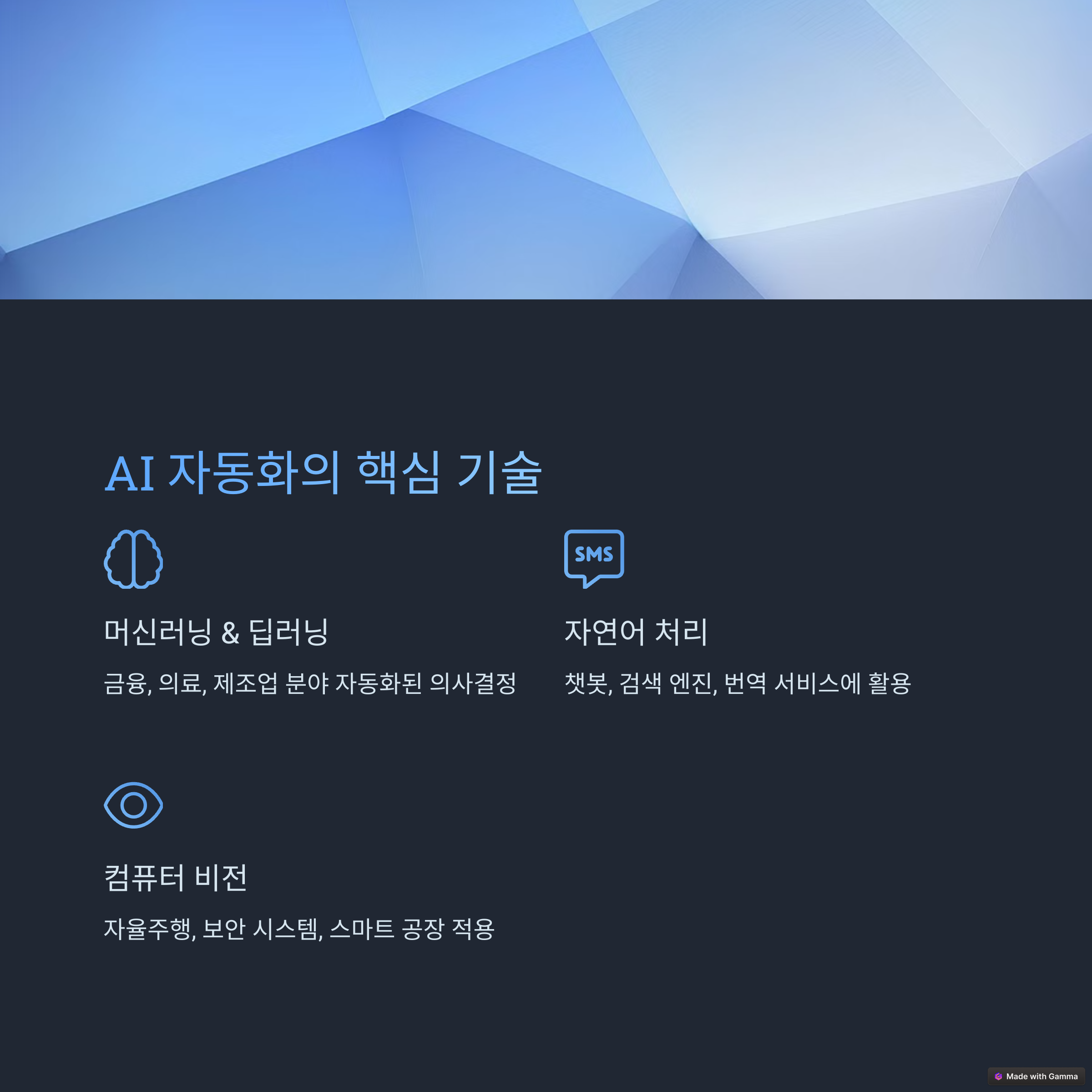 AI 자동화 기술은 여러 분야에서 적용되고 있으며, 그 핵심 기술들은 다음과 같습니다: