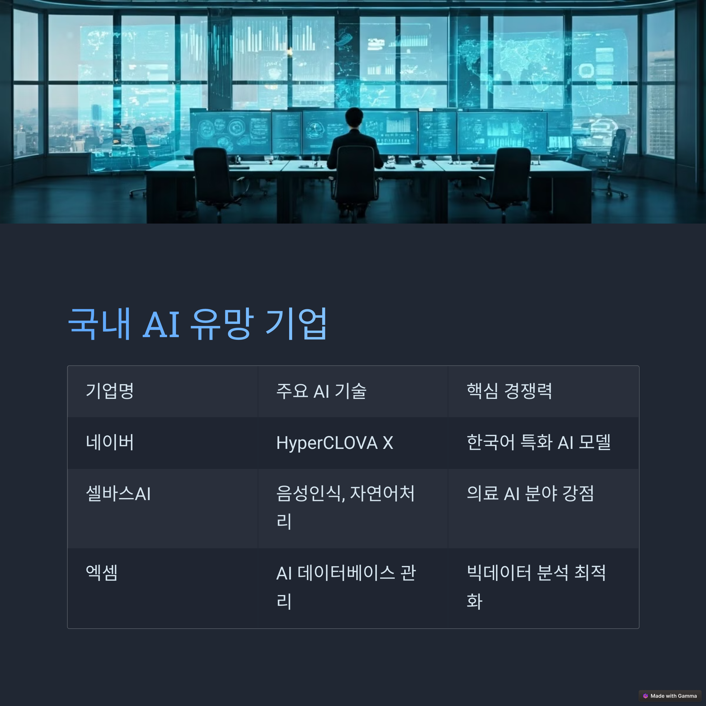 | 네이버 | HyperCLOVA X (AI 기반 검색, 음성 인식) | 한국어 특화 AI 모델 및 클라우드 AI 사업 확장 |