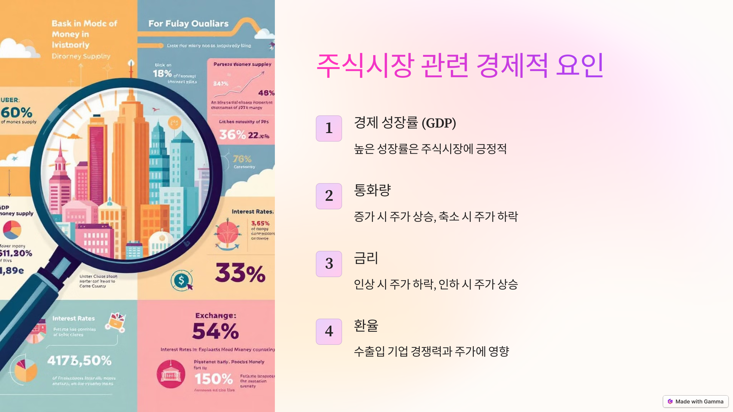 - 경제 성장률 (GDP): 높은 성장률은 주식시장에 긍정적 영향을 미침.