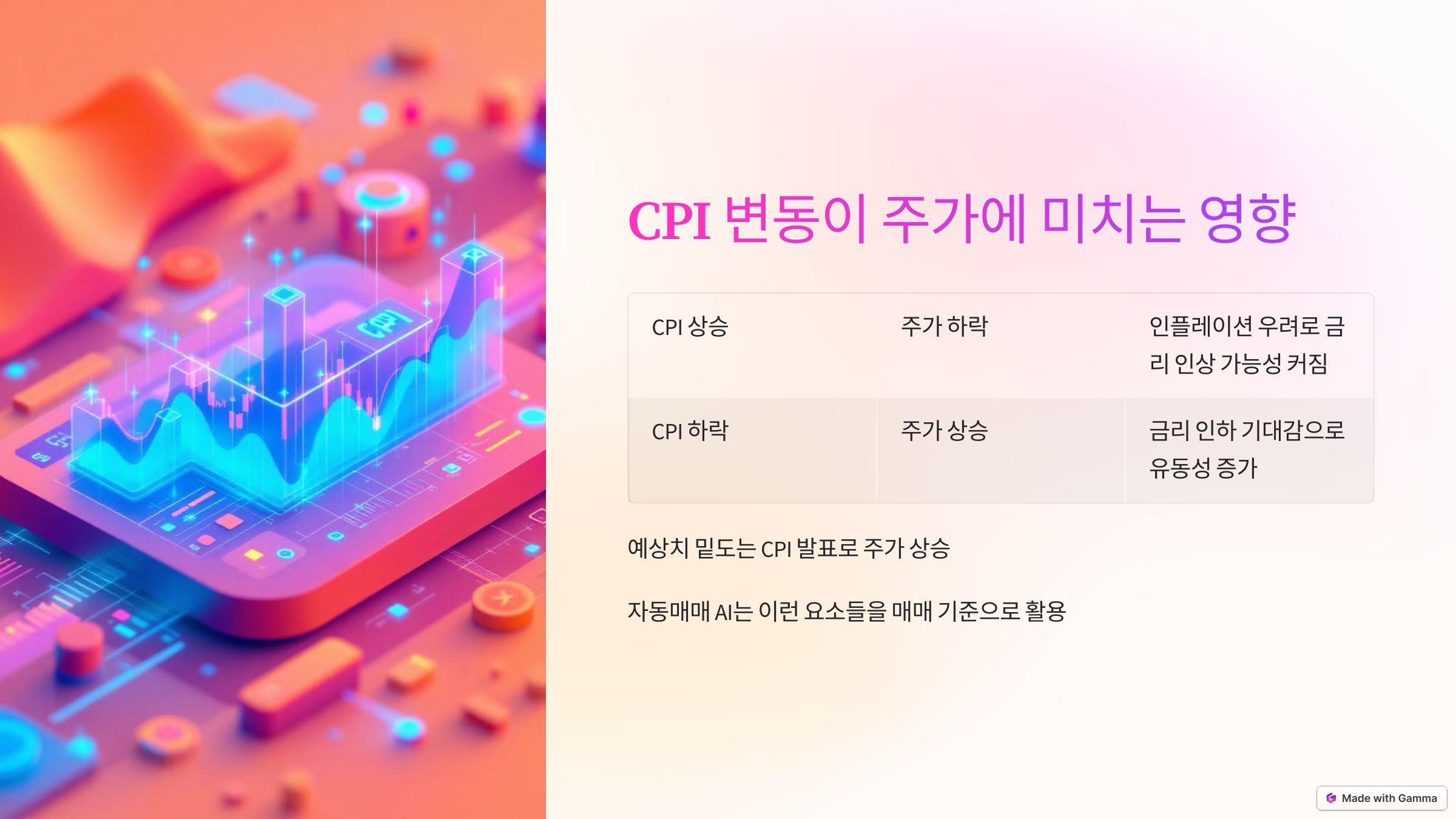 | CPI 하락 | 주가 상승 | 금리 인하 기대감이 커지면서 유동성이 증가하고, 주식시장에 긍정적인 영향을 미칩니다. |