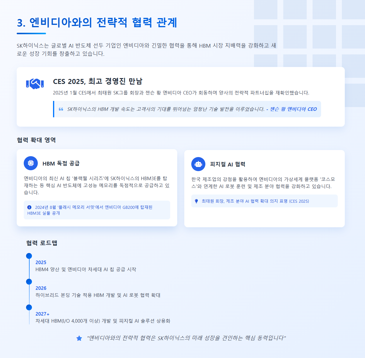 공룡인 엔비디아와의 끈끈한 협력 관계가 있어요. 2025년 1월에 열렸던 CES 2025에서 최태원 SK그룹 회장님과 젠슨 황 엔비디아 CEO가 만나는 장면은 정말 큰 화제가 되었죠. 그때 젠슨 황 CEO가 SK하이닉스의 HBM 개발 속도에 대해 극찬을 아끼지 않았다고 해요. 고객사의 기대를 뛰어넘는 엄청난 기술 발전을 이루었다면서요!