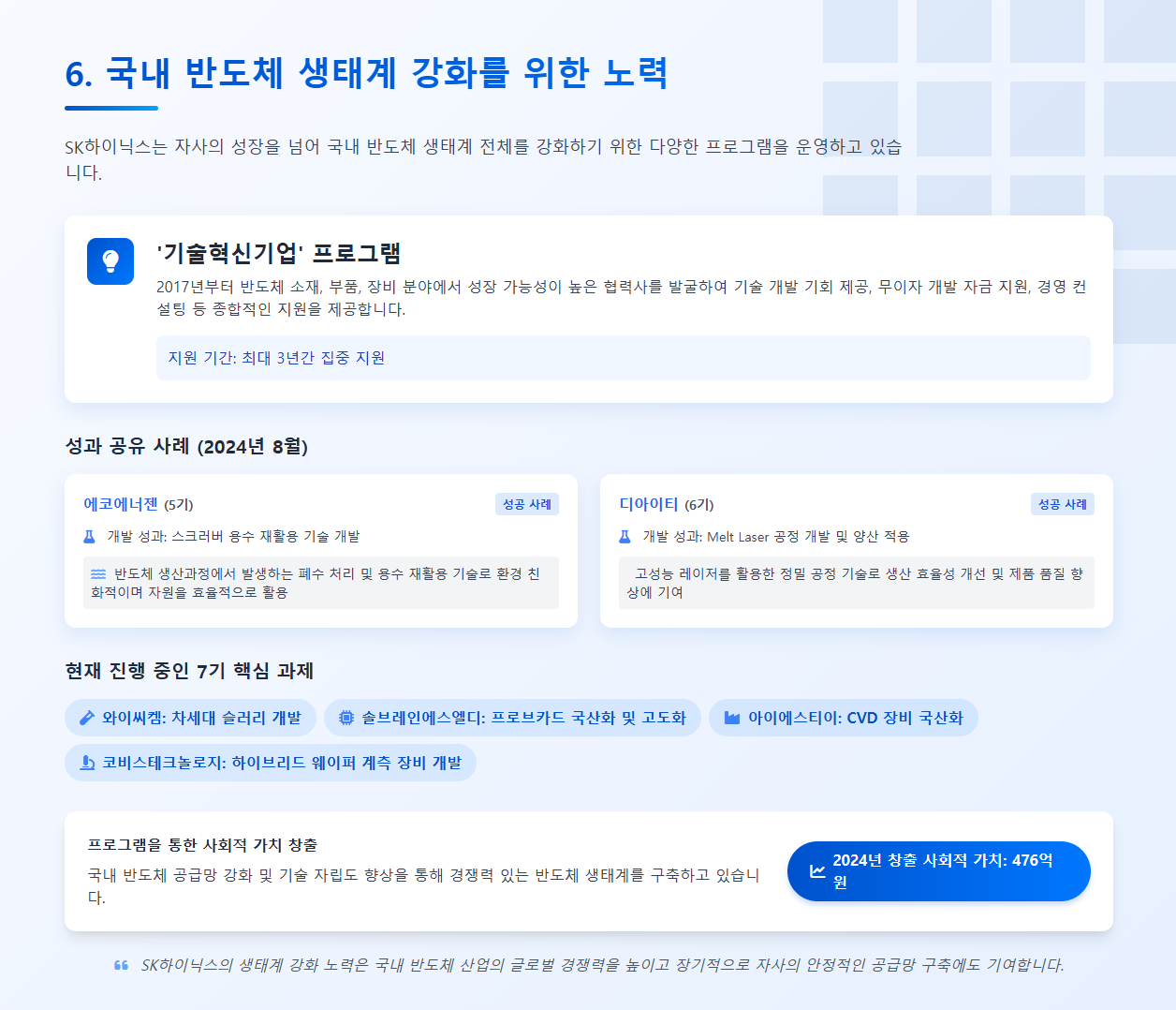 이런 노력들은 단순히 회사 이미지를 좋게 만들려는 것뿐만 아니라, 실제로 국내 반도체 공급망을 더 튼튼하게 만들고, 결과적으로 SK하이닉스 자신의 장기적인 경쟁력을 확보하는 데도 아주 중요한 역할을 하고 있다고 생각합니다.