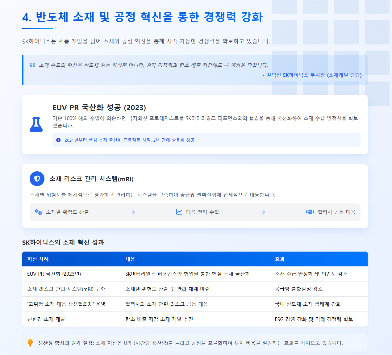 | EUV PR 국산화(2023년) | SK머티리얼즈 퍼포먼스와 협업을 통한 핵심 소재 국산화 | 소재 수급 안정화 및 의존도 감소 |