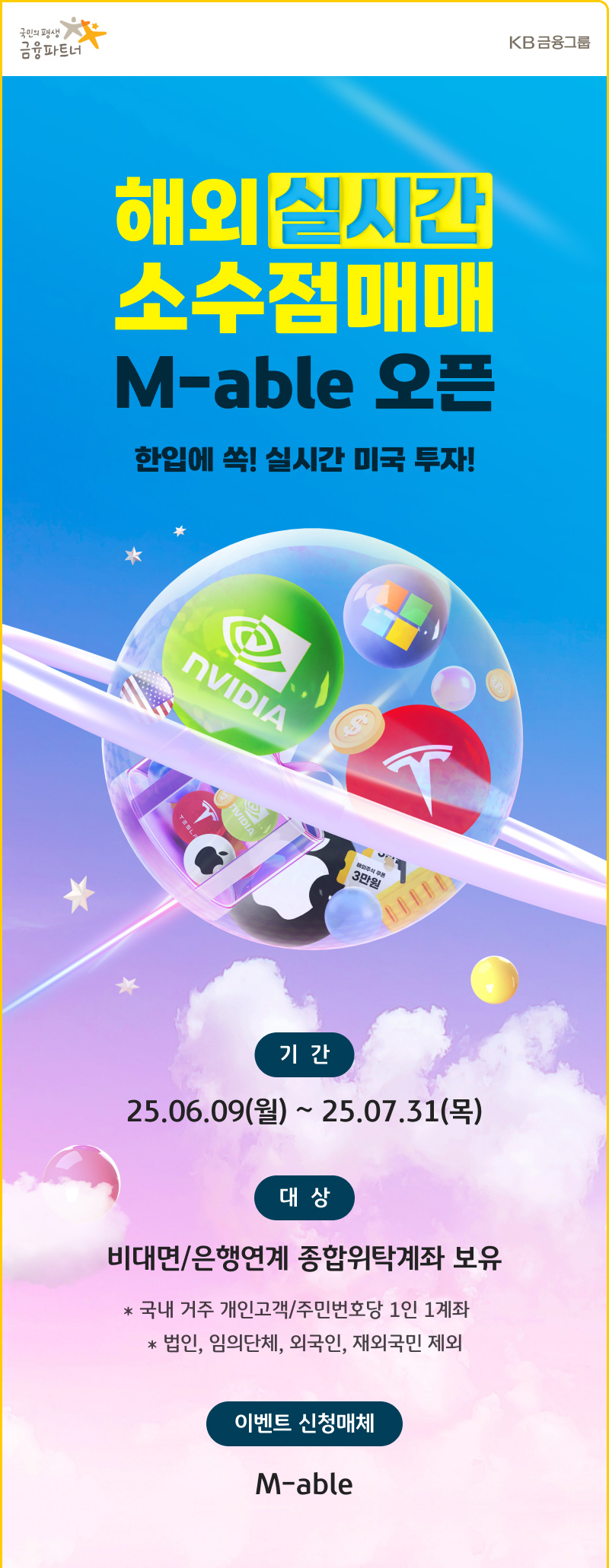 KB증권이 M-able 플랫폼을 통해 해외 소수점 거래 서비스를 전면 확장하며 다양한 혜택 이벤트를 시작했습니다.