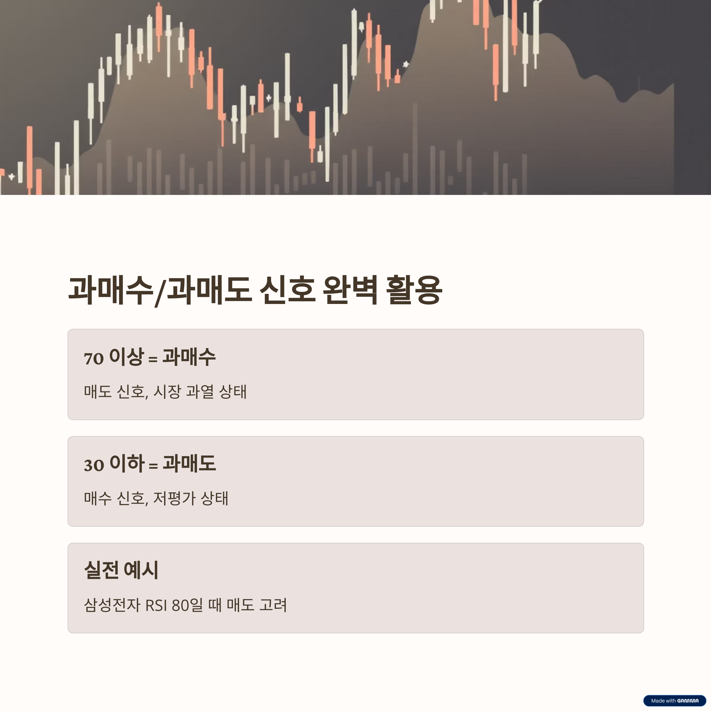 - 시장 특성에 따라 다르게 봐야 해요: 주식 시장, 코인 시장, 선물 시장... 시장마다 RSI 기간이나 과매수/과매도 기준을 다르게 봐야 해요.